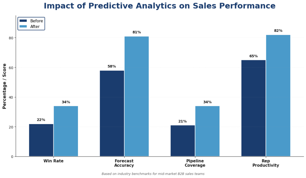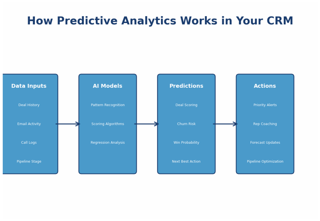 Predictive analytics use historical data and machine learningMachine Learning Machine Learning is an aspect or type of artificial intelligence whereby a computer possesses the ability to learn various things by itself without explicitly being programmed to. to forecast future outcomes at the deal, rep, accountAccount Account refers to a record of primary and background information about an individual or corporate customer, including contact data, preferred services, and transactions with your company., or customerCustomer Customer is an individual or an organization that purchases a product or signs up for a service offered by a business. level. Examples include deal win probability scoring, churn risk scoring, and next-best-action recommendations. Output is typically a score (0 to 100) plus a reason. The model updates continuously as new data flows in.