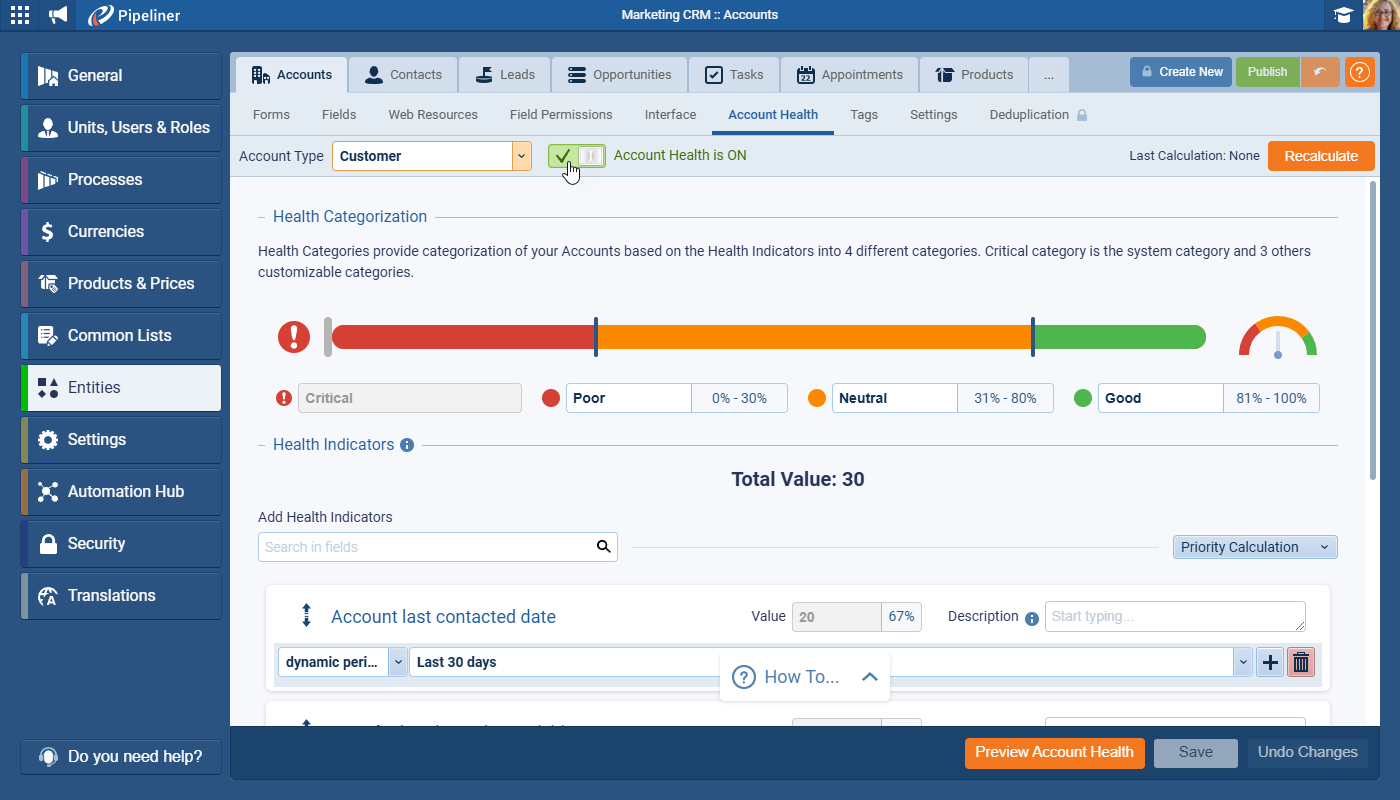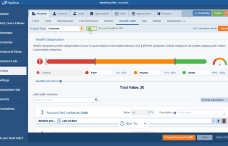 - Real-Time Diagnosis: Define custom Health Indicators using any Pipeliner CRM field—from “No. of related won opportunities” to “Last Contacted Date.”
