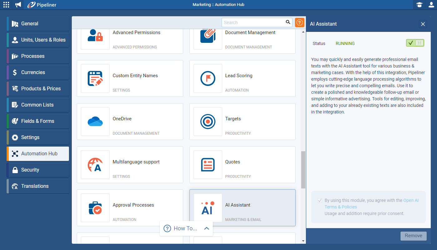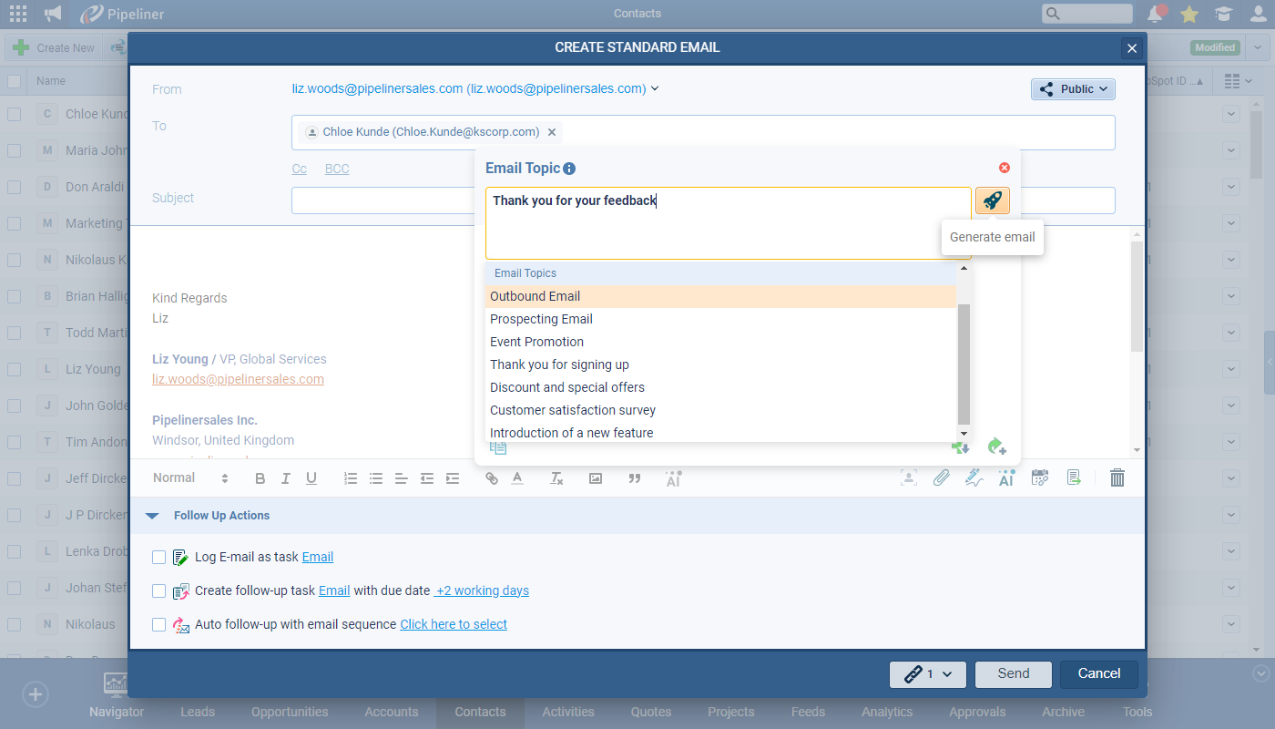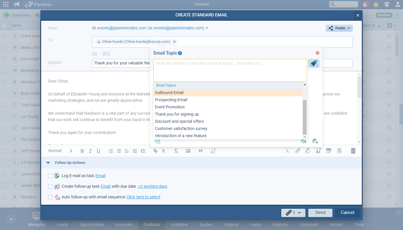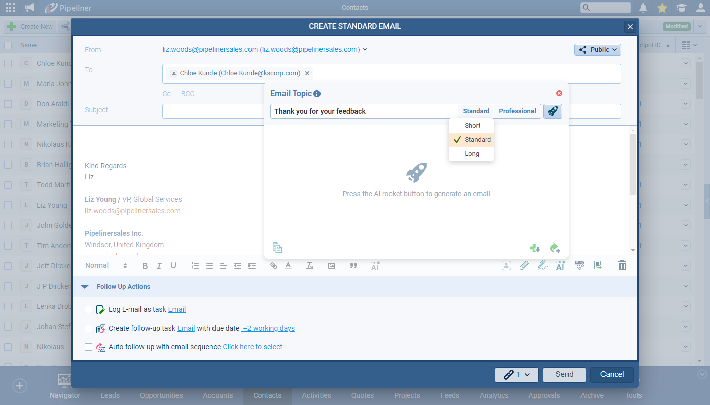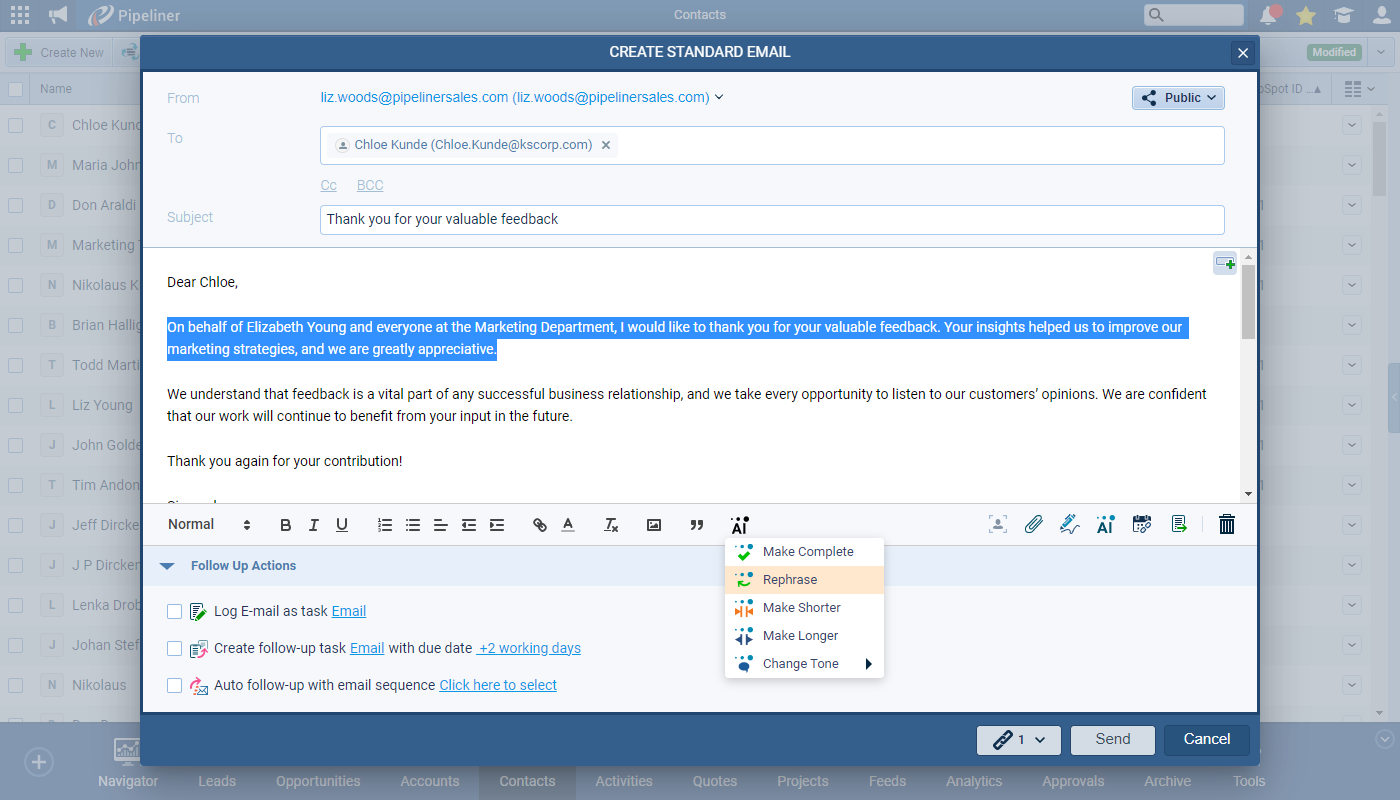 • Seamless Workflow Integration: Whether you are sending a standard one-to-one email, launching a Mass Email campaign, or setting up automated Email Sequences and Automatizer steps, the AI Assistant is available directly within the Pipeliner CRM email composer, ensuring a truly seamless workflow.