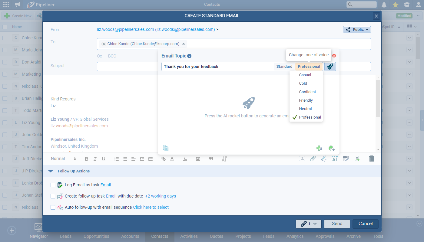 Leveraging the creative fluency of the world’s most advanced AI models, Voyager composes, polishes, and perfects professional business emails instantly, ensuring your outreach is always consistent, compelling, and perfectly on-brand, all without ever leaving the familiar environment of Pipeliner CRM.