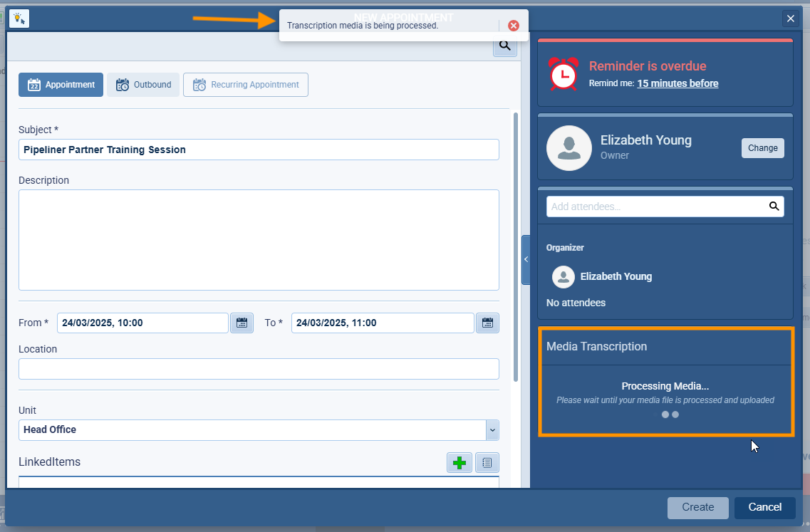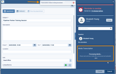 - Intelligent Background Processing: Once the media is uploaded, you can save the Activity and move on to your next task. Pipeliner CRM handles the resource-intensive transcription process in the background, notifying you the moment the finished transcript and analysis are ready.