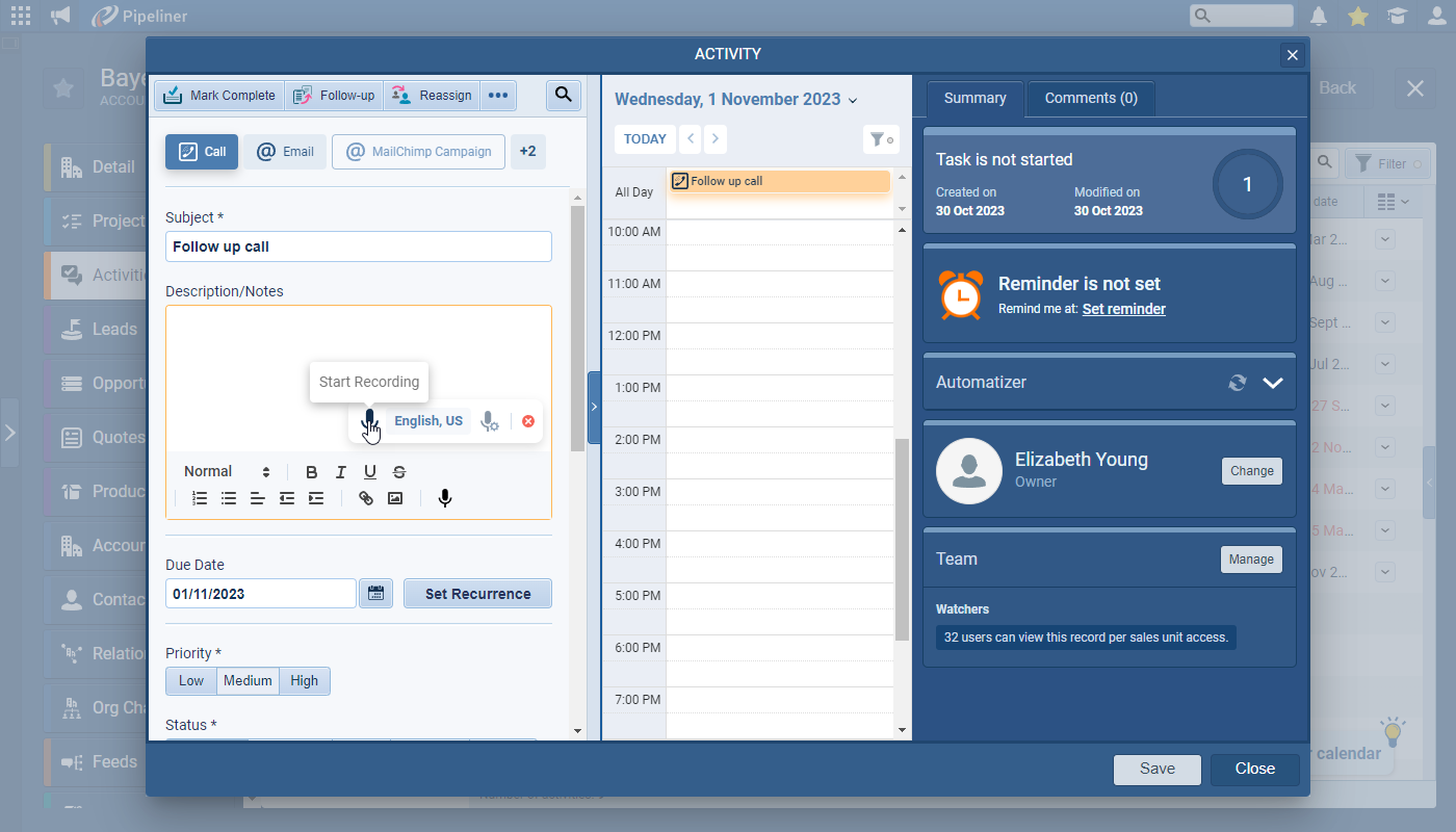 - Streamline Your Workflow: Enjoy a seamless, intuitive experience by dictating directly into any rich text field across Pipeliner CRM, including emails, activities, and notes, without ever needing to copy/paste from external apps.