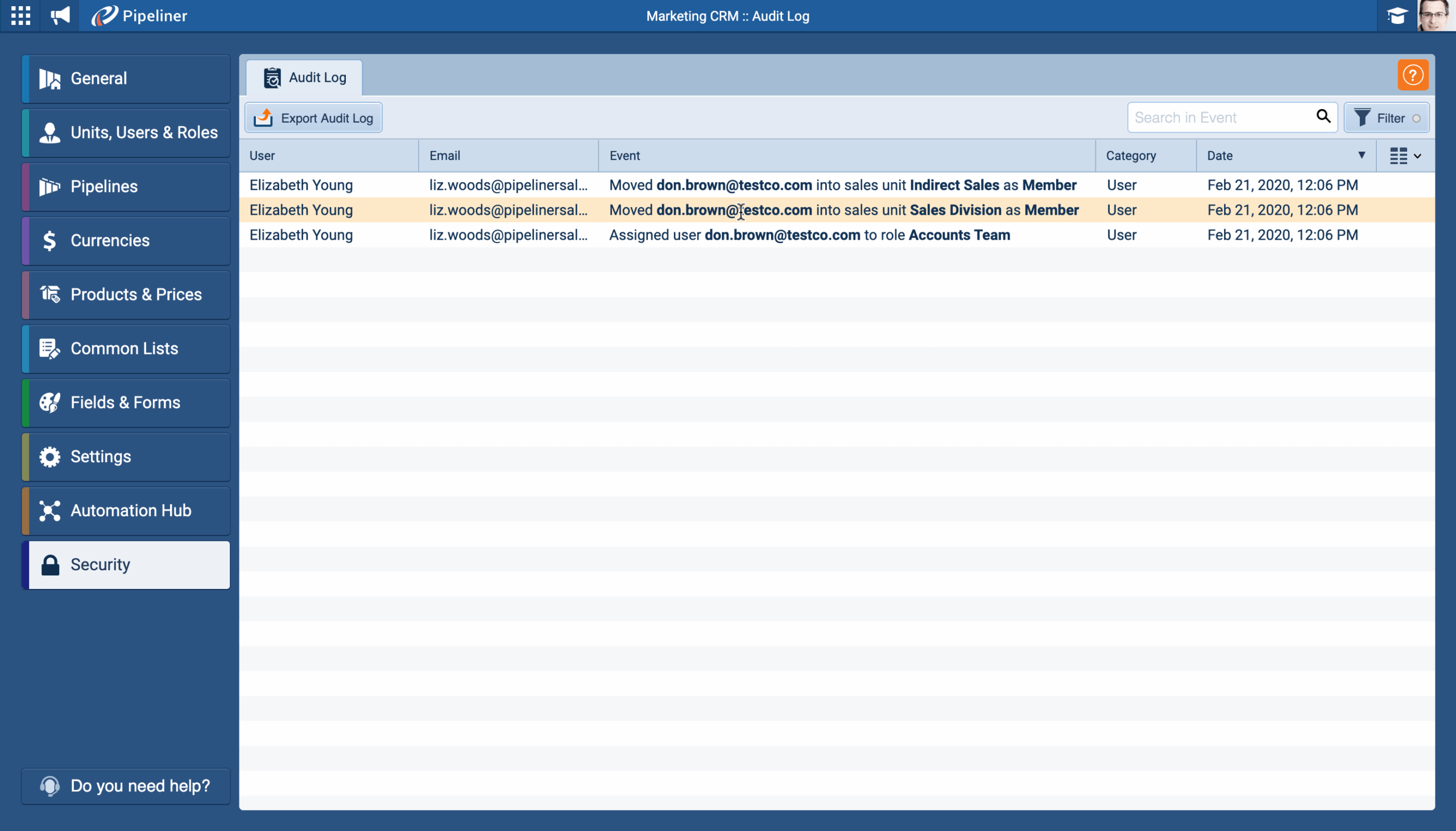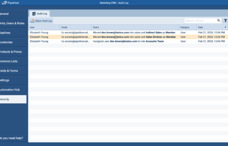 The Pipeliner CRM Audit Log captures detailed information on critical events across the entire Admin Module, ensuring you have a complete picture of your system’s configuration and data security.
