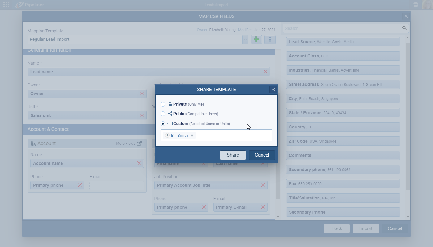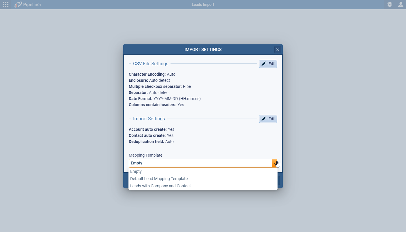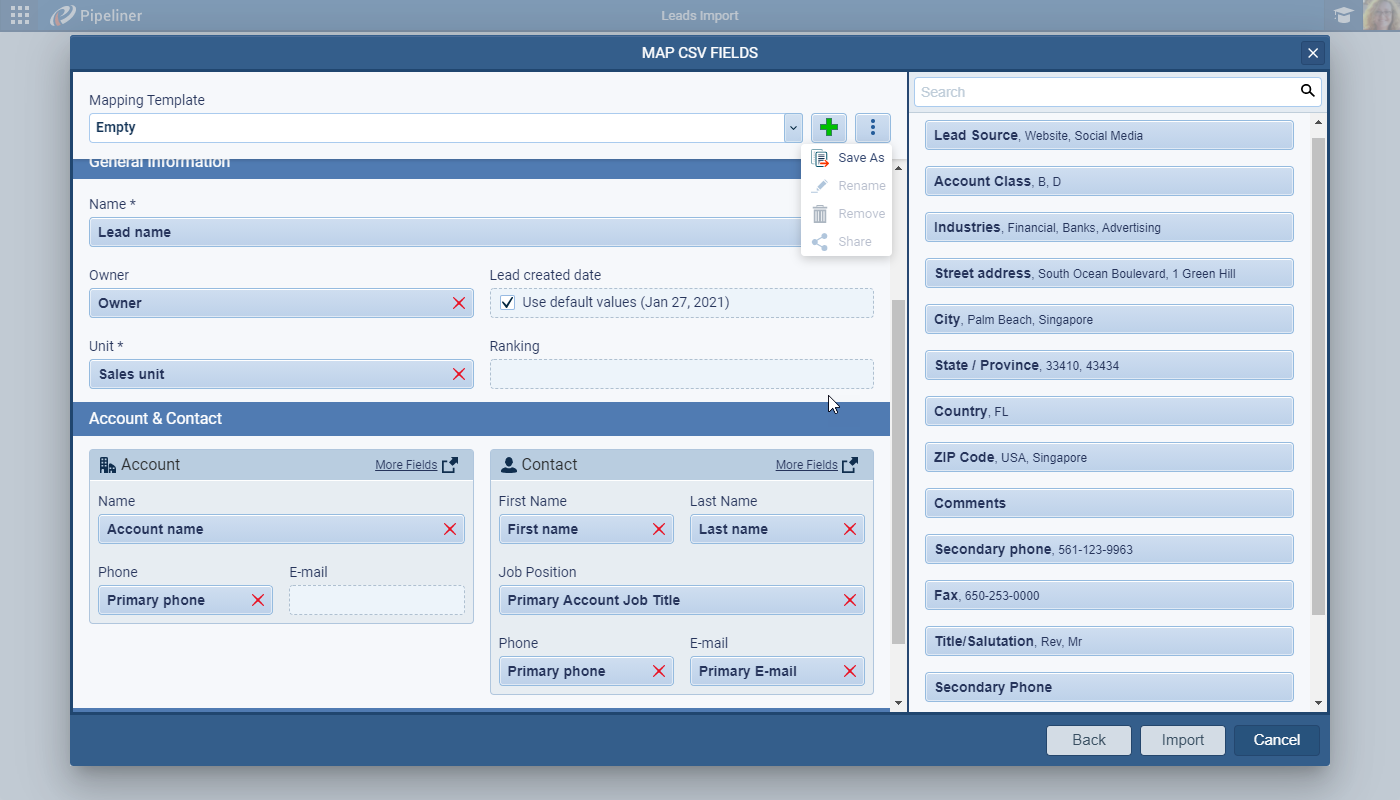 - Smart Record Matching: Pipeliner CRM intelligently matches leads to existing accounts and contacts, or it can create new ones for you during the import.