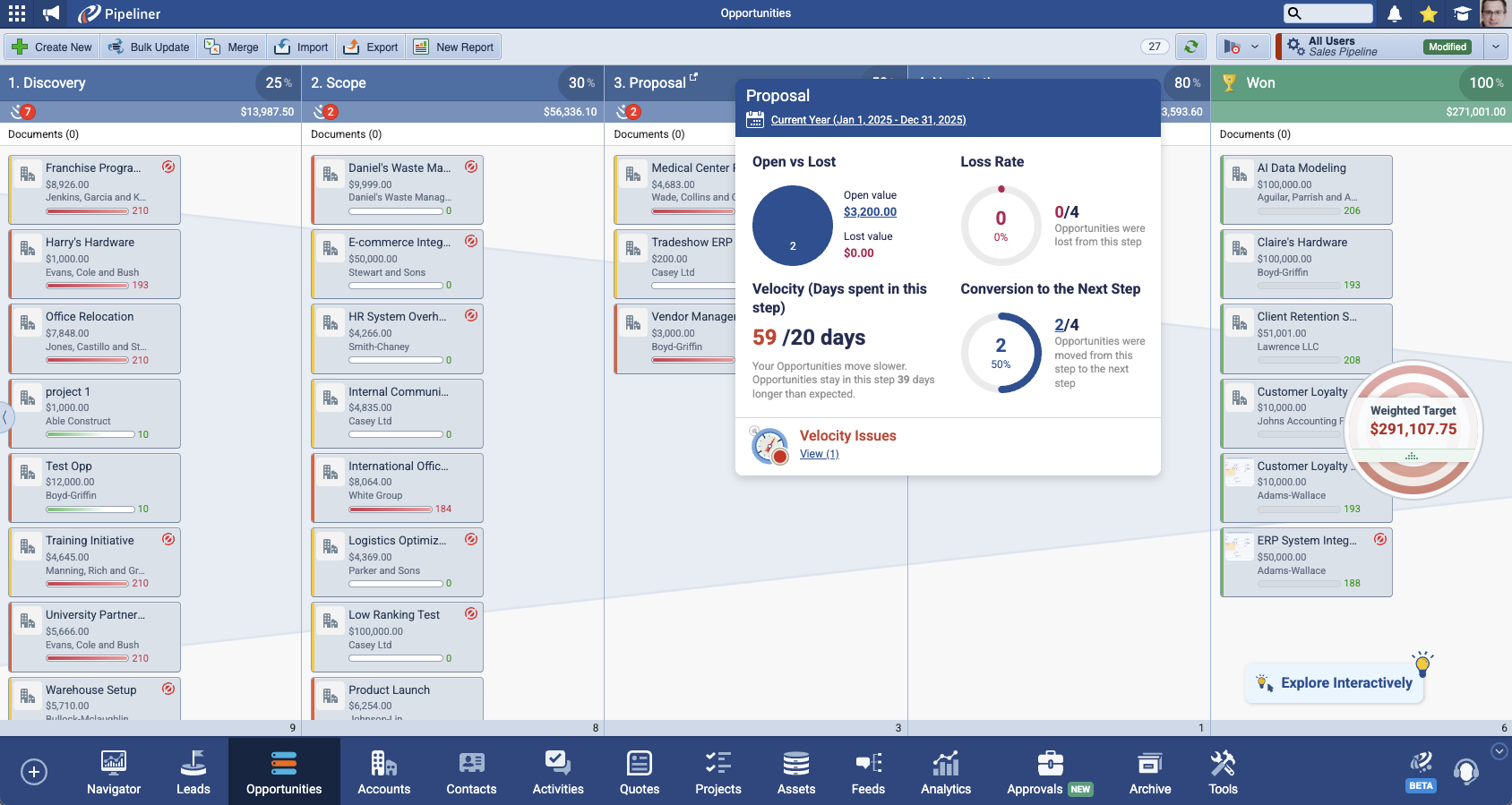 - Efficiency and Speed with Accelerated Sales Velocity: Stale deals are profit killers. Implement Velocity (time limits) on specific steps to automatically flag opportunities that are stalled. Keep deals flowing, shorten your sales cycle, and maximize pipelinePipeline Sales pipelineis a visual representation of the stage prospects are in the sales process. throughput.