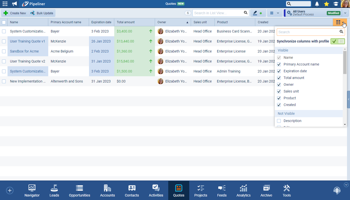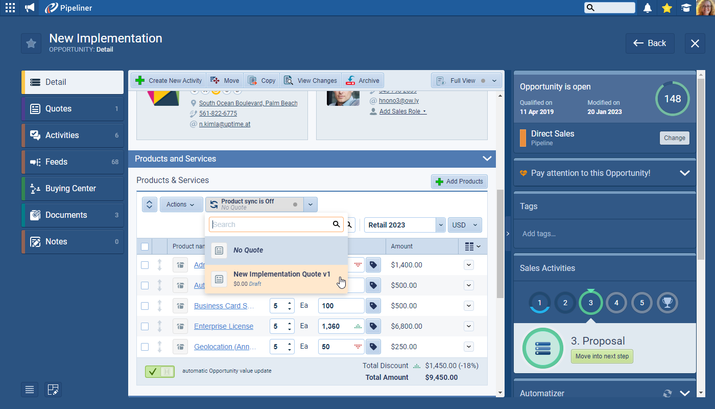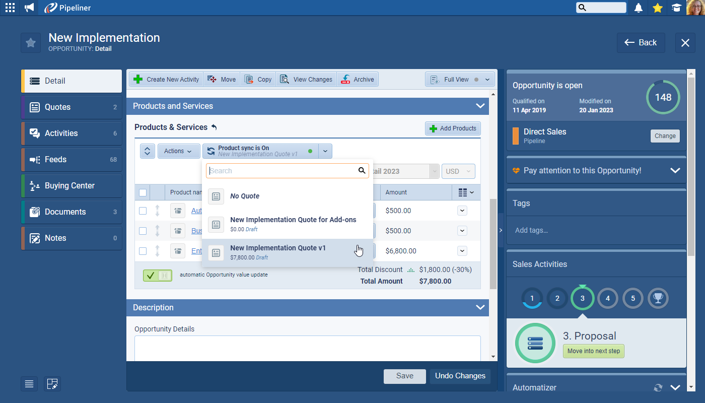 Pipeliner CRM is unique because it allows you to create multiple Quotes (different options or revisions) linked to a single Opportunity. Once a Quote is accepted, you can use Product Sync to ensure the final, winning configuration is automatically transferred back to the Opportunity, keeping your data and pipelinePipeline Sales pipelineis a visual representation of the stage prospects are in the sales process. forecast perfectly aligned.