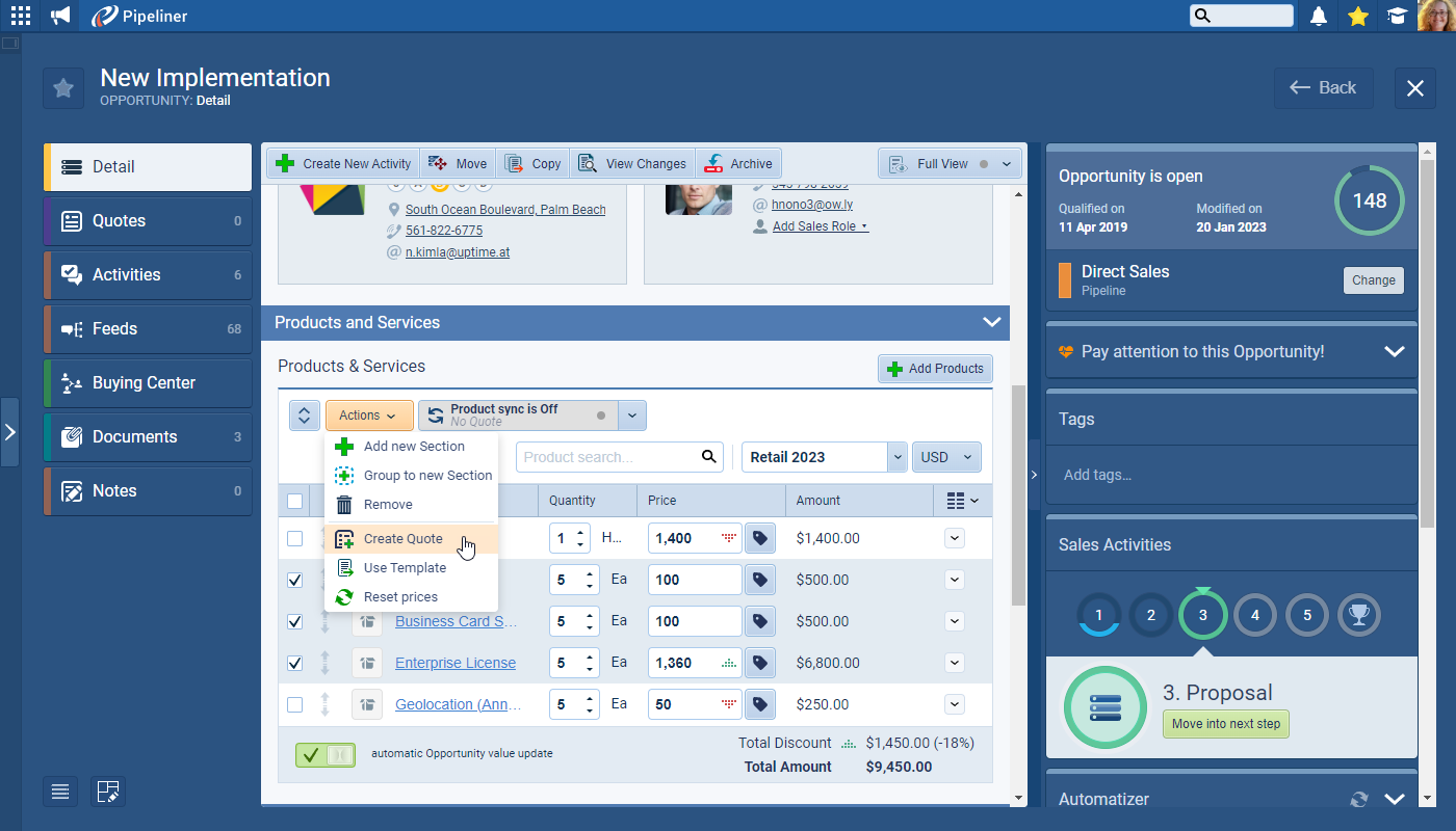 Create a new quote directly from the Opportunity in a few clicks. Your quote automatically inherits the current Products, Services, AccountAccount Account refers to a record of primary and background information about an individual or corporate customer, including contact data, preferred services, and transactions with your company., and Contacts. Do you need to quote only a few items? Select the specific line items you want and generate a targeted proposal instantly.