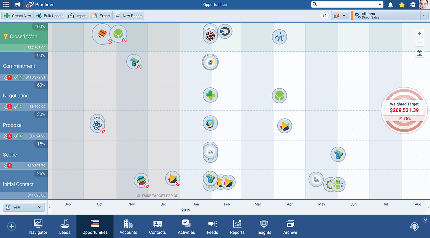 Pipeliner CRM gives you a real-time, visual overview of your entire pipeline. Track progress, see which deals are on track, and identify bottlenecks instantly. Targets allow you to set and monitor goals, whether by deal count or value, so you always know where you stand against your objectives.
