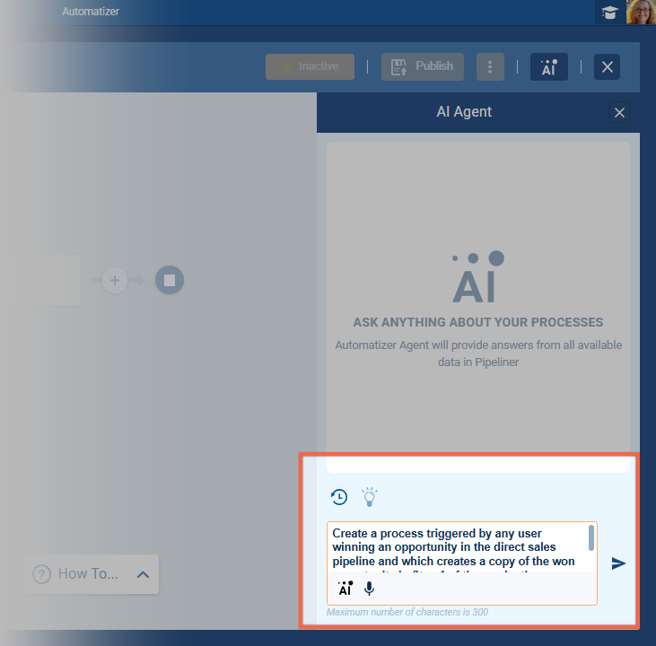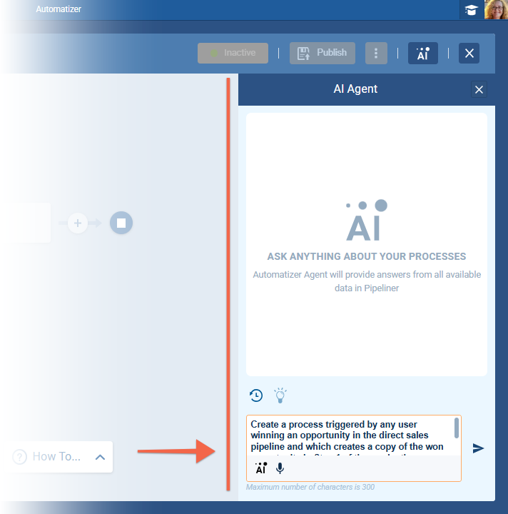 Users can type — or speak — their prompts to the text input area in the AI Agent side panel. Note there is a 300-character limit for user prompts.