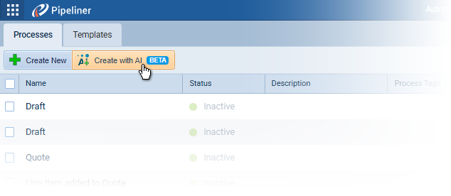 Click on the "Create with AI" button to initiate the creation of a new process with AI assistance. All new processes created by the agent default to a Personal process owned by the Current UserUser User means a person who uses or consumes a product or a service, usually a digital device or an online service., named "Draft" and in the unpublished draft status.
