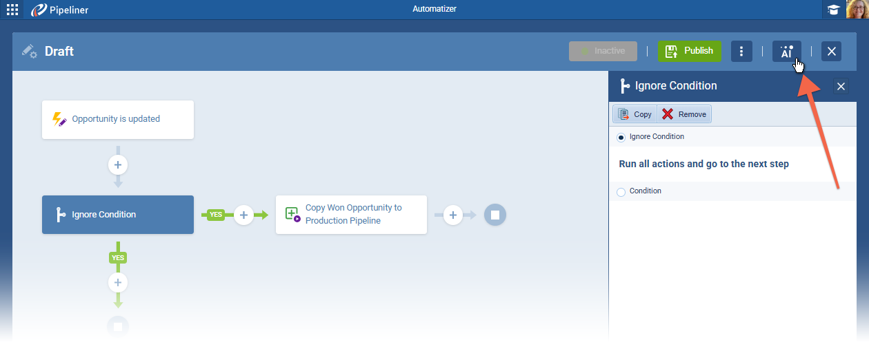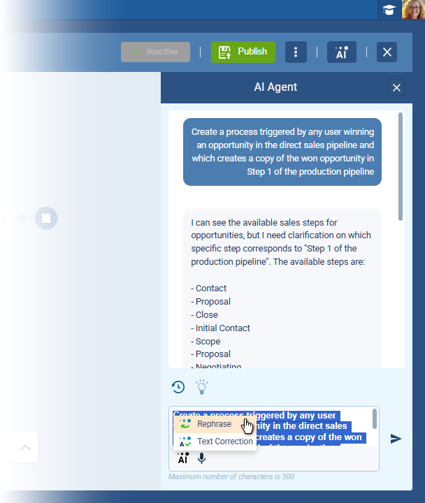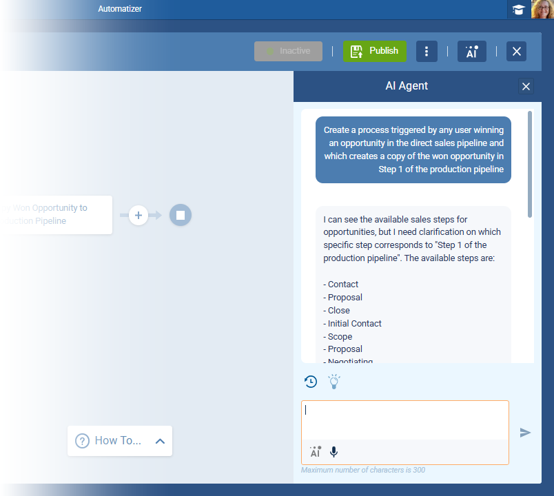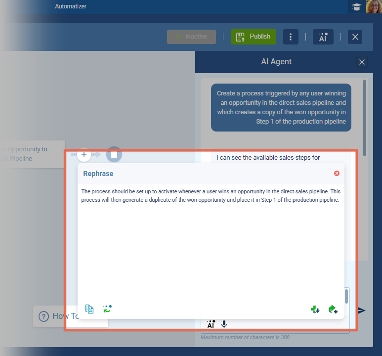 The AI will guide the user to define the minimum requirements for publishing a process: Trigger, Condition, and Action.