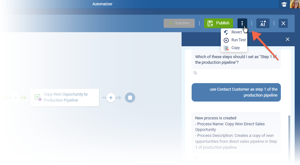 The AI generated process can be copied at any point by clicking on the three dots icon.