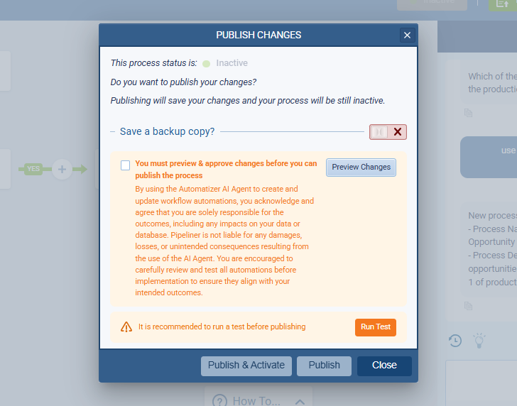 When the user is happy with the draft process, they will click on "Publish". For AI-generated processes, the user must preview and approve the process by ticking the acknowledgement.