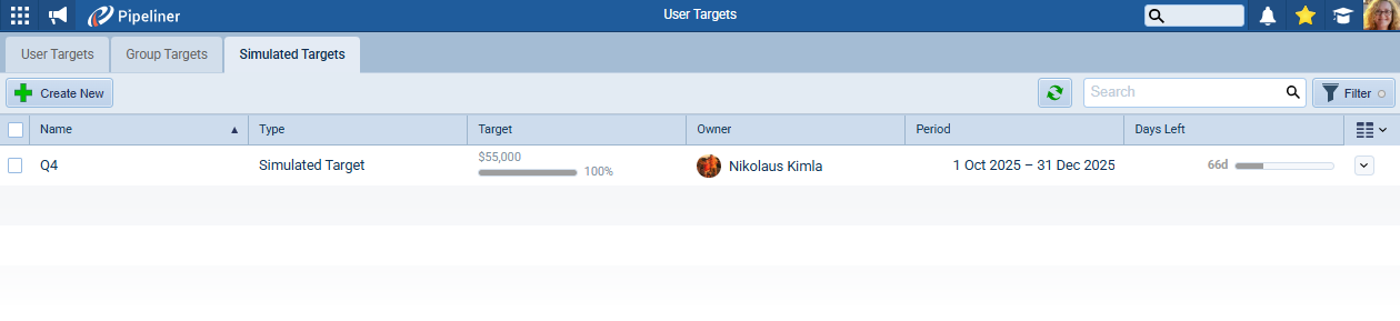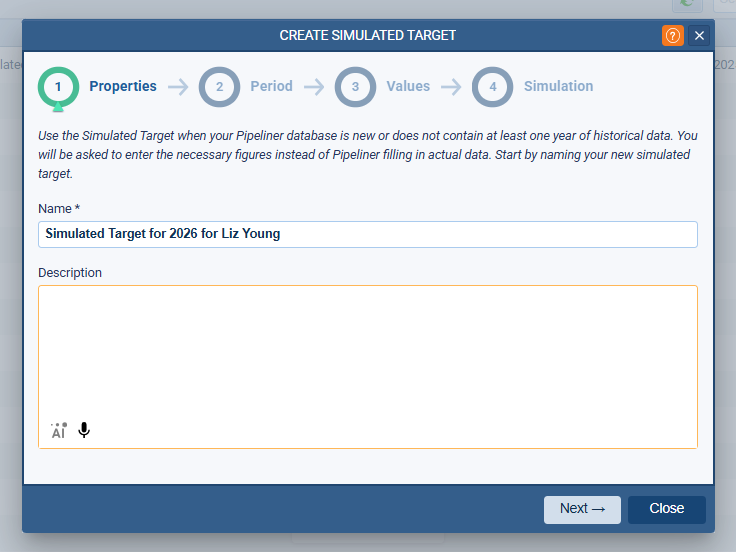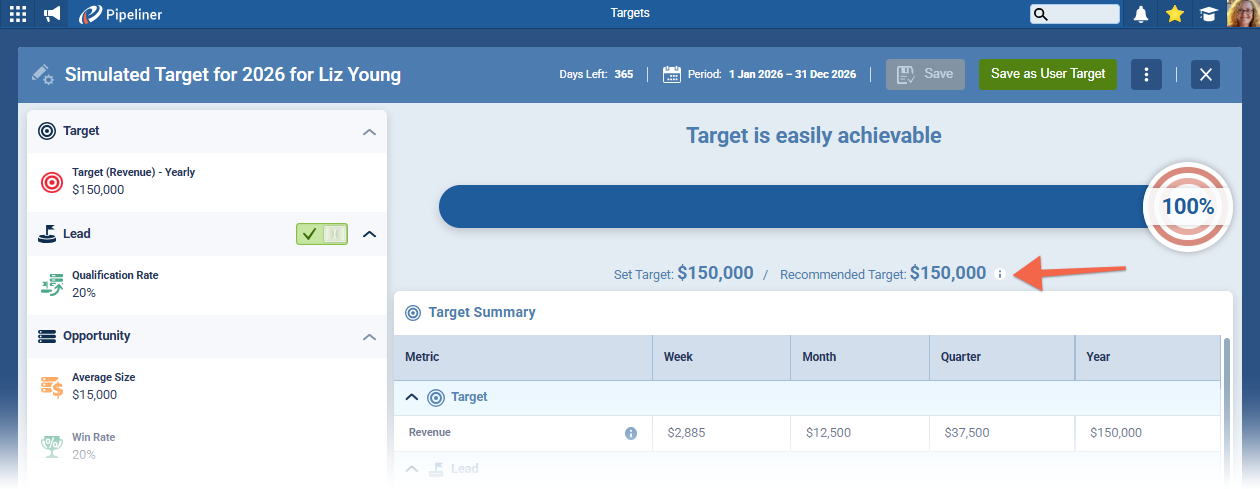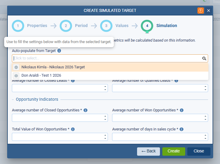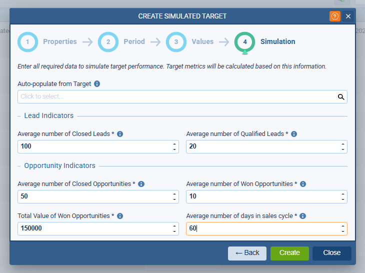 Creating a Simulated Target allows users to fill in input fields for LeadLead Lead refers to a prospect or potential customer (who can be an individual or organization) that exhibits interest in your service or product; or any additional information about such entity. Indicators and/or Opportunity Indicators that simulate historical data to calculate target metricsMetrics Metrics are quantities that are measured and used to:. This is particularly useful when your organisation is new to using Pipeliner or you are setting up a Target for a new user and do not have sufficient historical data on Leads and Opportunities to populate the recommended Target values.