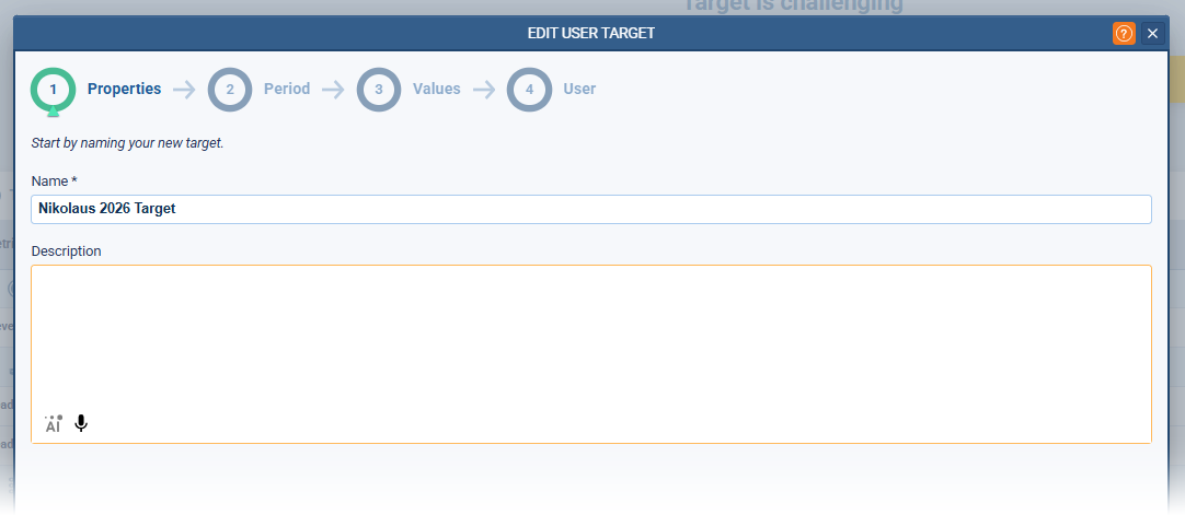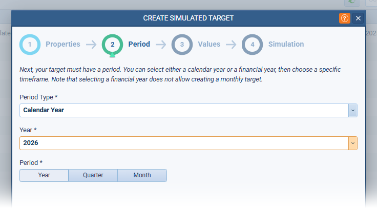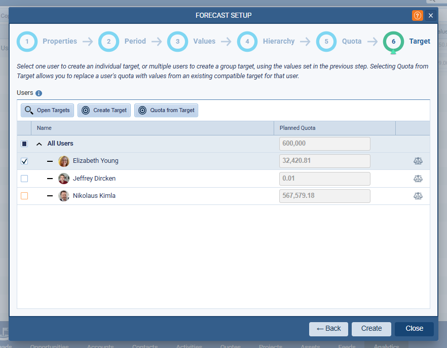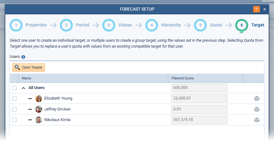 In addition to an improved wizard-driven creation process for User and Group Targets, in this release we have added a new Target type, Simulated Targets, which allow sales managers to model and estimate target performance without being tied to a user’s historical dataData Data is a set of quantitative and qualitative facts that can be used as reference or inputs for computations, analyses, descriptions, predictions, reasoning and planning.. We’ve also added the ability to create targets directly from the Forecast Setup wizard.
