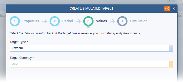 Step 3: Values — choose from the Target Type options ‘Leads Created‘, ‘Leads Qualified‘, and ‘RevenueRevenue Revenue is the amount of money a business generates during a specific period such as a year or a quarter; also called sales.‘ (default) and, if Revenue is selected, the currency for the Target from a dropdown list of enabled currencies.
