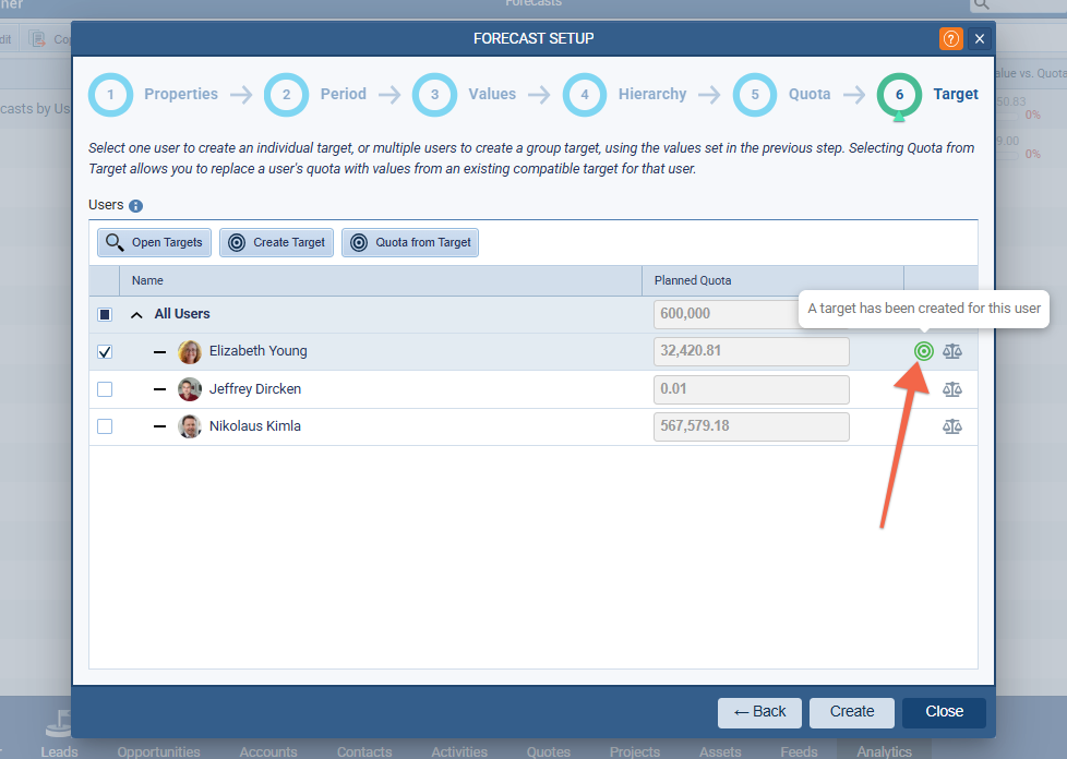 An icon will appear next to a user’s name to indicate that a target has been created for them during the current wizard session.