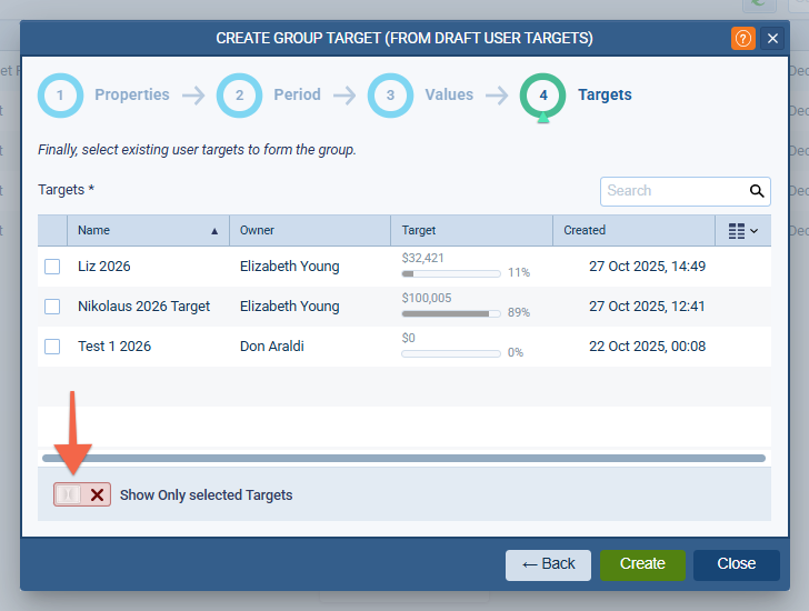 The Target step during the creation of a forecast is only enabled if users are included in the forecast hierarchy and Forecast Period settings are compatible with Target Period settings. Targets created from forecasts will always have Period Type set to ‘Calendar Year‘. If compatibility checks fail, the Target step will display a placeholder instead of the user list. The user can still skip the step and create the forecast.
