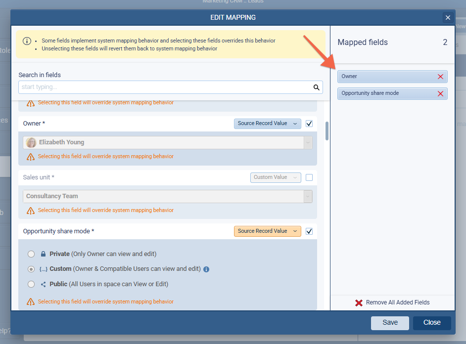This feature enhances the Field Mapping and ConversionConversion Conversion is the process of turning a target consumer into a paying customer; or more generally, the point at which a user performs a specific action favorable to a marketer or a seller. forms by adding support for several key system fields: Owner, Share mode, Editors, and Watchers. This allows for more comprehensive record creation and conversion workflows. Additionally, the UI for these fields on detail forms will be updated for better visual indication.