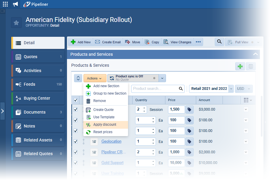 When Products have been added to an Opportunity using a Price List, users can select one or more product rows and then select the option "Apply Discount".
