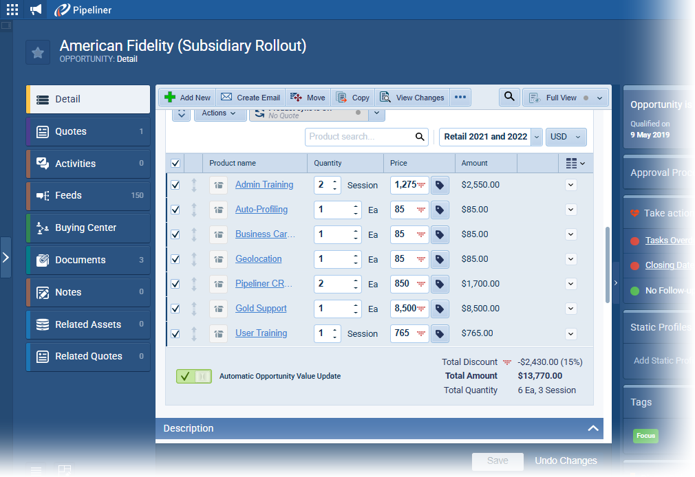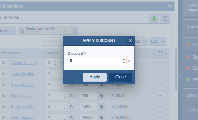 This feature introduces a bulk action to apply a percentage-based discount to multiple selected products within an Opportunity's product list. This streamlines the process of discounting, as users no longer need to apply discounts to each product individually.