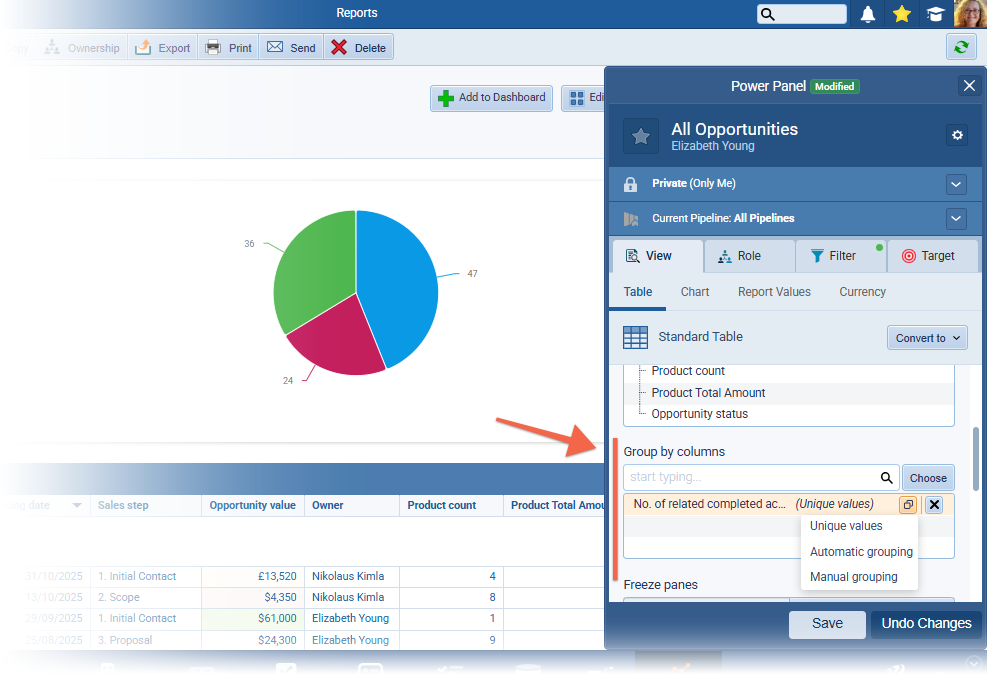 - The current Target chart component has been replaced with the new "Pipeline Target" visual style which displays the achieved value prominently in the center, with the target value shown below it.