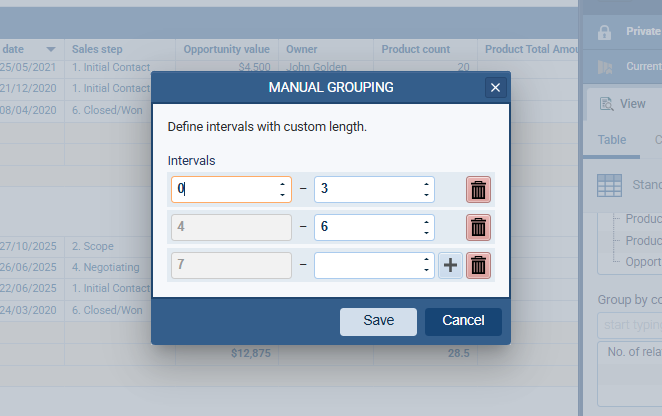 - Users can add new intervals. An "Add" action is enabled on the last interval if its end value is defined.
