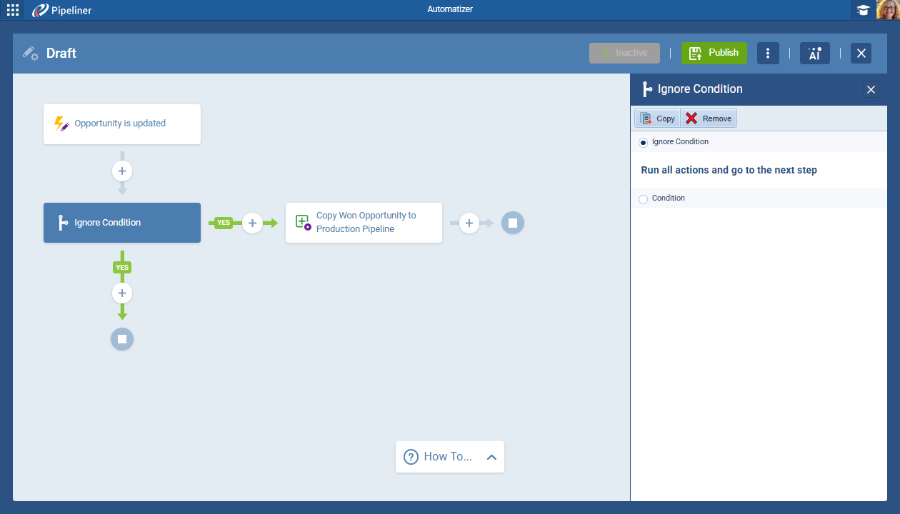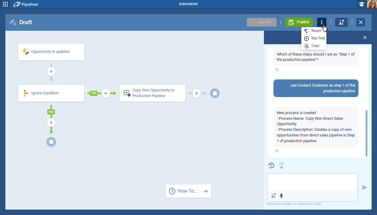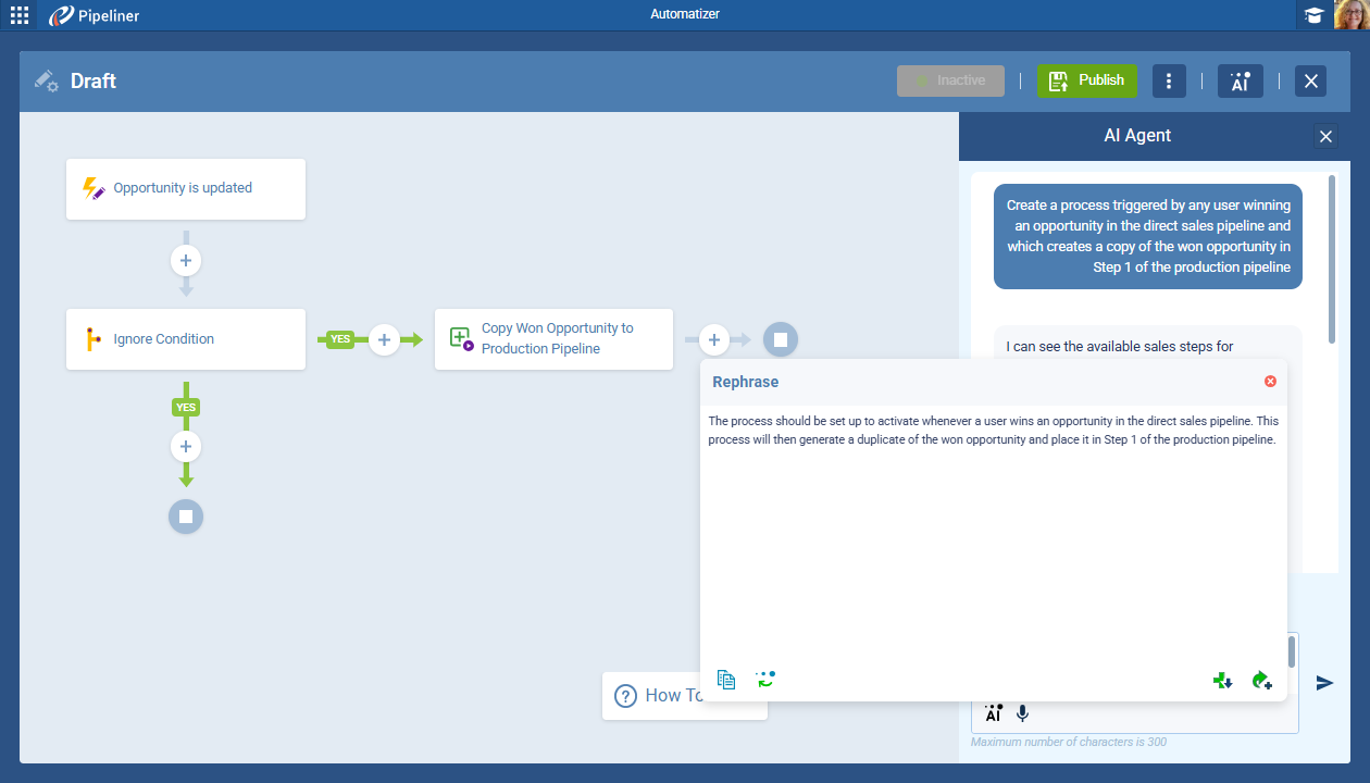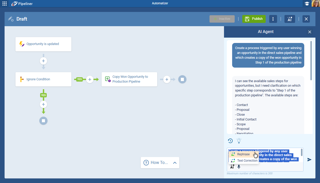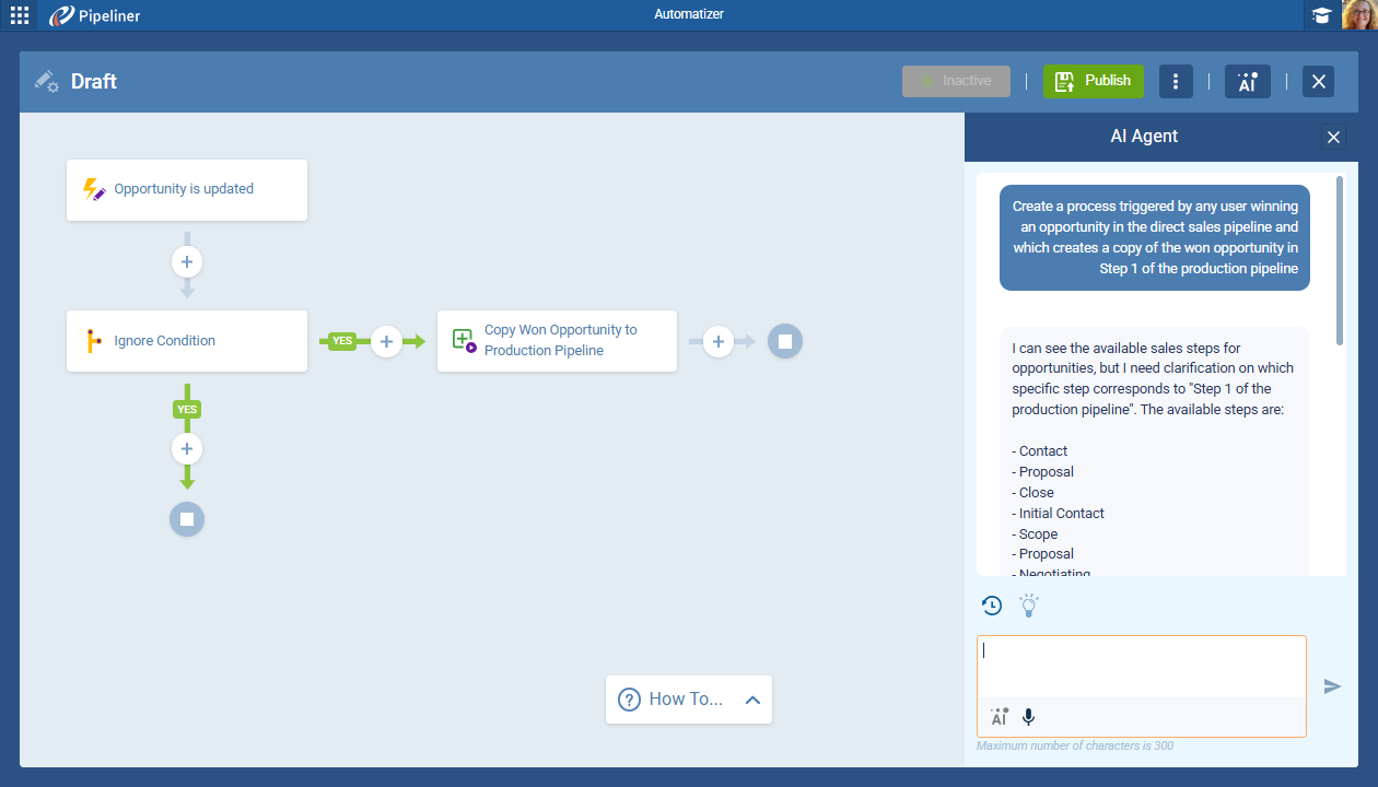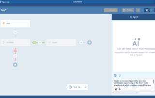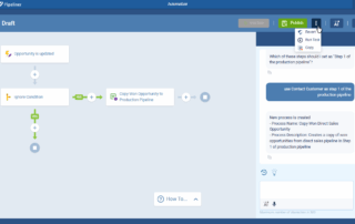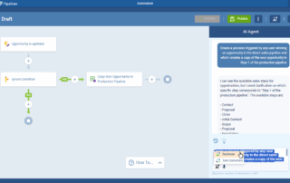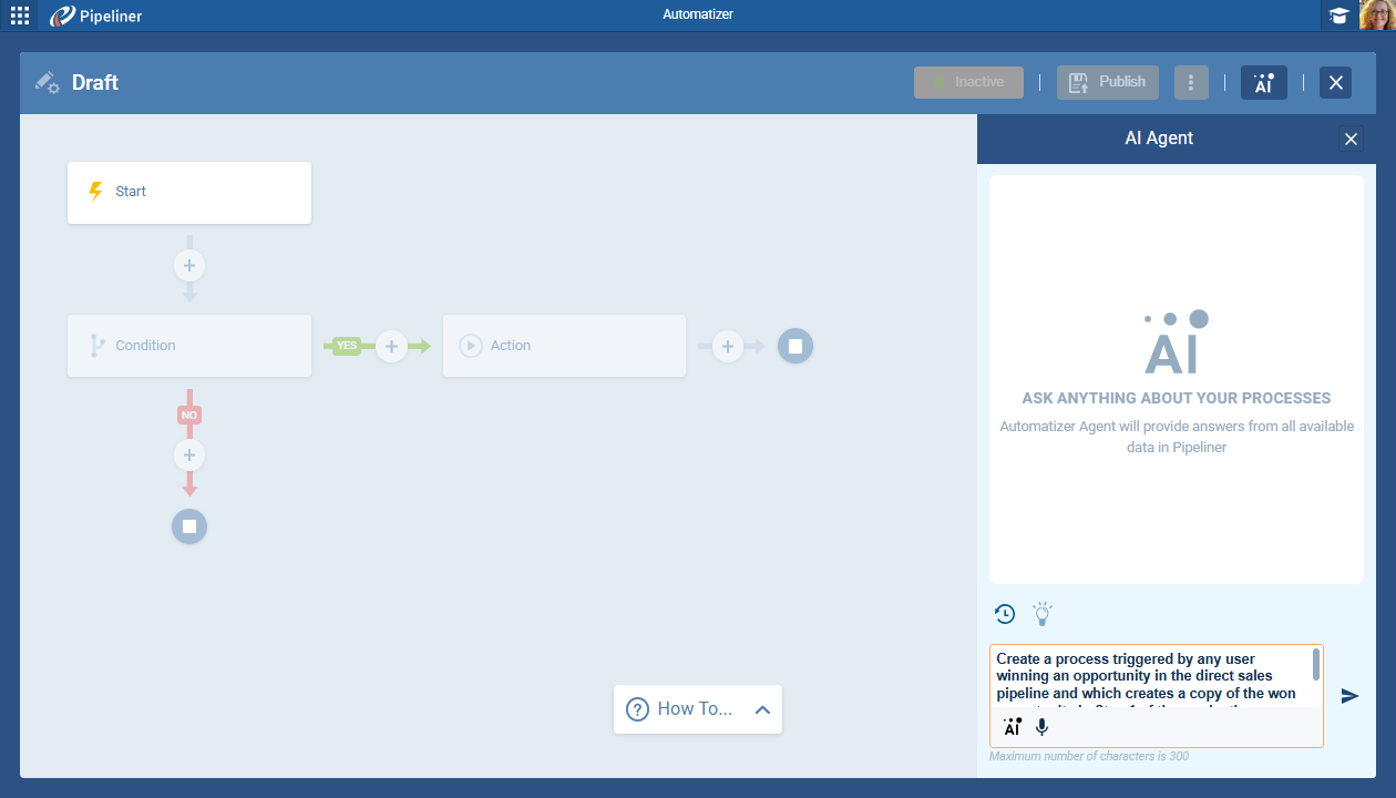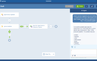 The AI will guide the user to define the minimum requirements for publishing a process: Trigger, Condition, and Action.