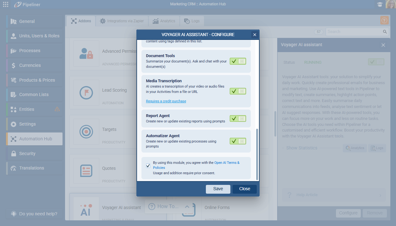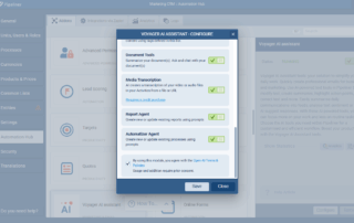 The Automatizer Agent is enabled from the Configure options when selecting the Voyager AI Assistant in the Automation Hub. A toggle switch controls the feature’s availability. It is turned ON by default. When enabled, the “Create with AI” action appears in the Automatizer, and the “AI Agent” button is visible in the process editor.