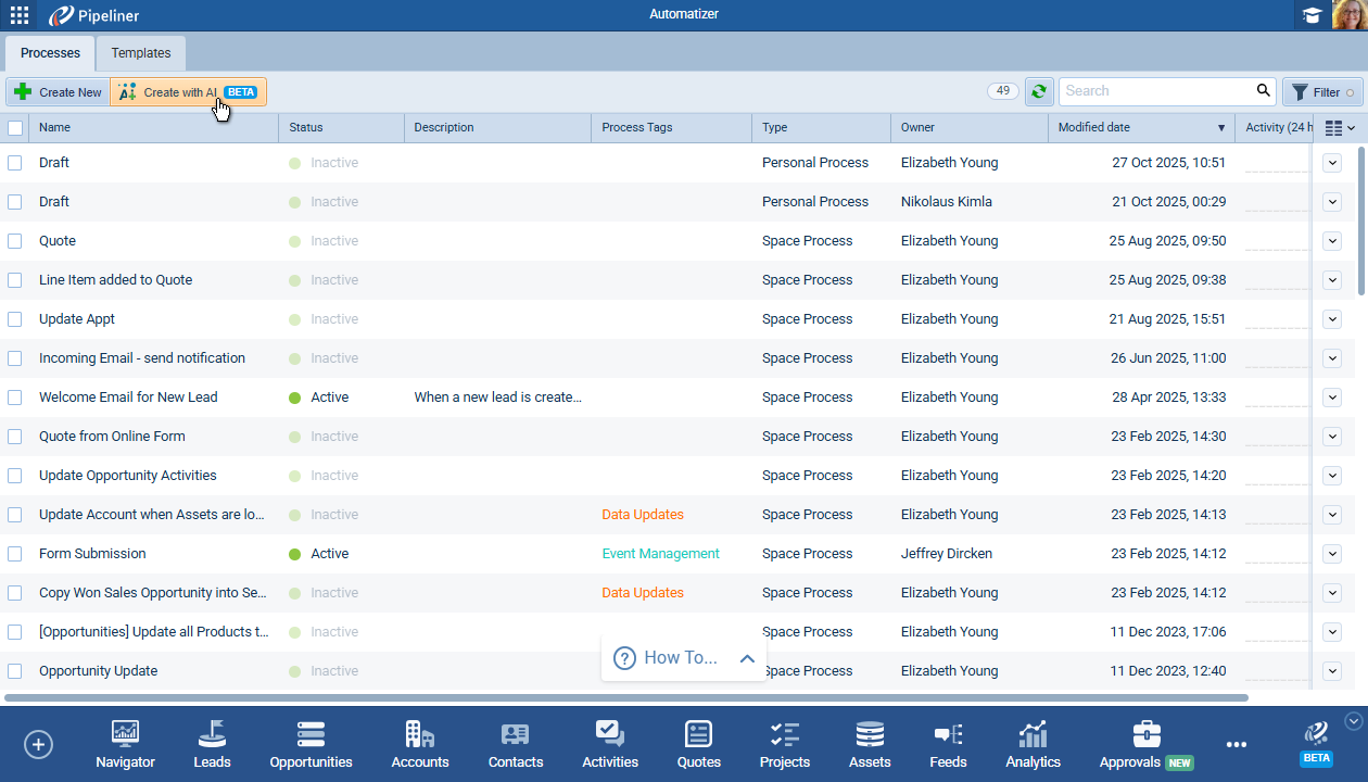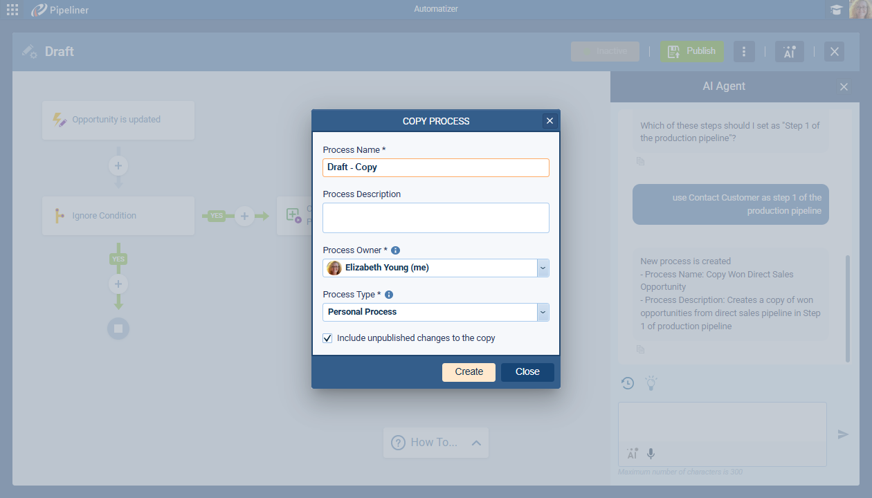 Click on the “Create with AI” button to initiate the creation of a new process with AI assistance. All new processes created by the agent default to a Personal process owned by the Current UserUser User means a person who uses or consumes a product or a service, usually a digital device or an online service., named “Draft” and in the unpublished draft status.