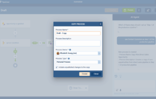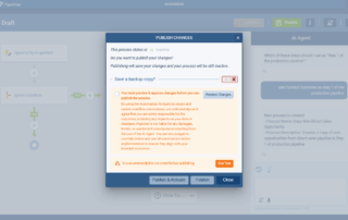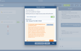When publishing, users can opt to create a backup copy of the current process. The toggle to “Save a backup copy?” is OFF by default. When switched on, an input name for the backup copy appears which is pre-filled with “{process_name} – Backup {datetime.now()}“.