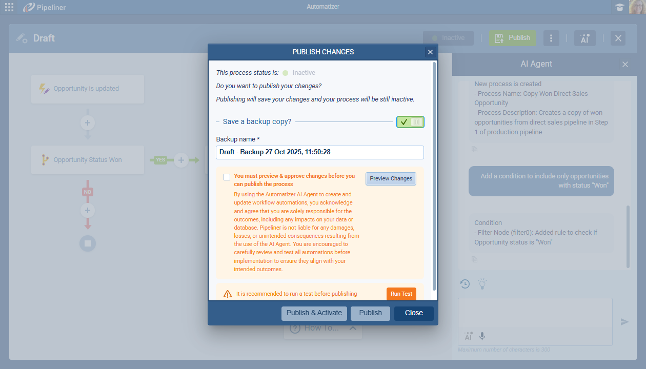 When the user is happy with the draft process, they will click on “Publish”. For AI-generated processes, the user must preview and approve the process by ticking the acknowledgement.