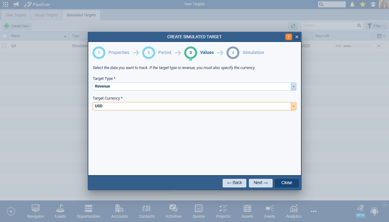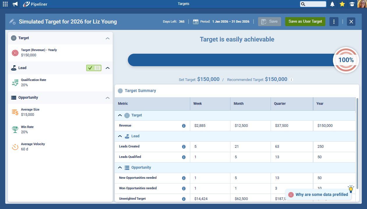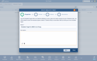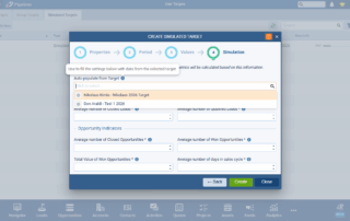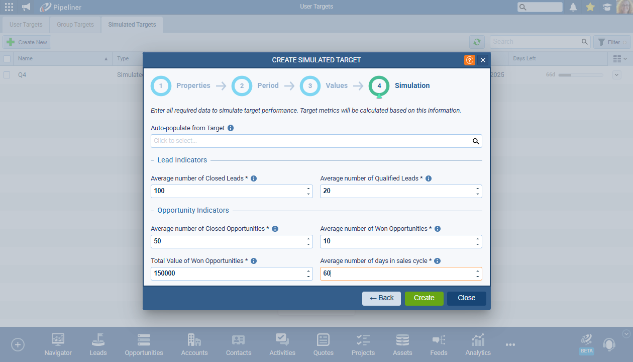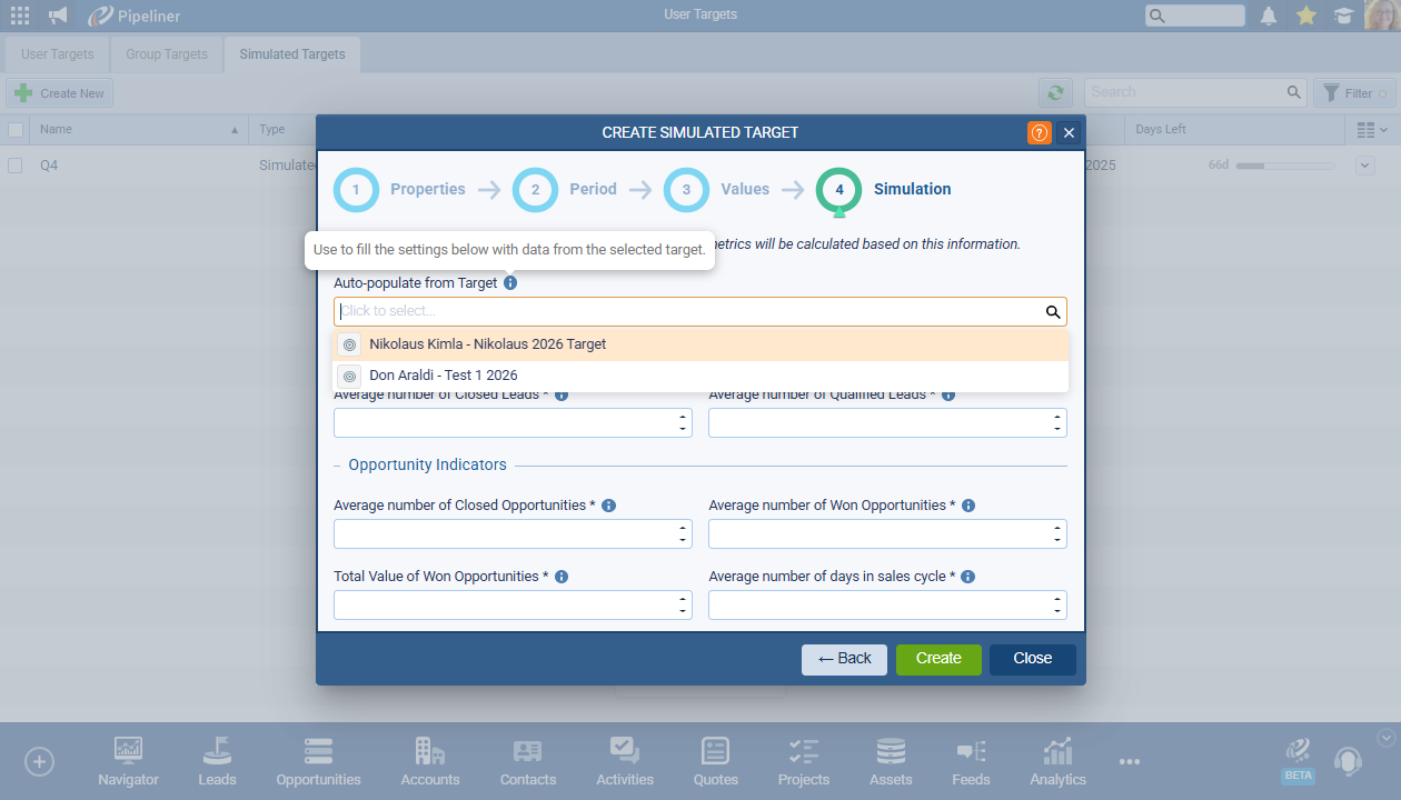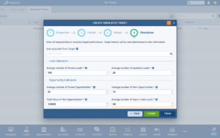 Creating a Simulated Target allows users to fill in input fields for LeadLead Lead refers to a prospect or potential customer (who can be an individual or organization) that exhibits interest in your service or product; or any additional information about such entity. Indicators and/or Opportunity Indicators that simulate historical data to calculate target metricsMetrics Metrics are quantities that are measured and used to:. This is particularly useful when your organisation is new to using Pipeliner or you are setting up a Target for a new user and do not have sufficient historical data on Leads and Opportunities to populate the recommended Target values.