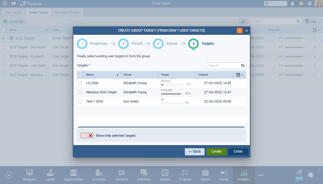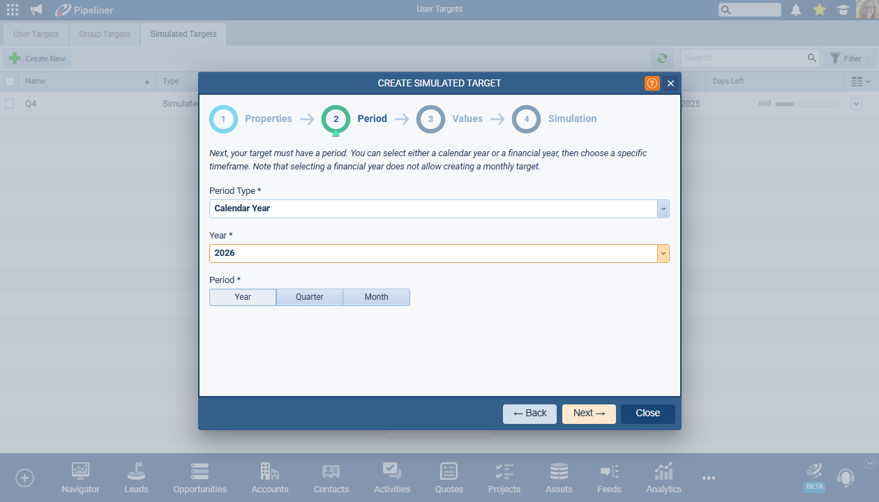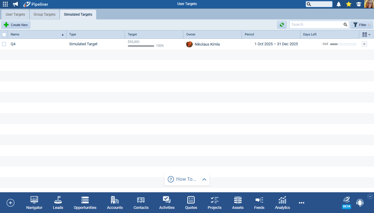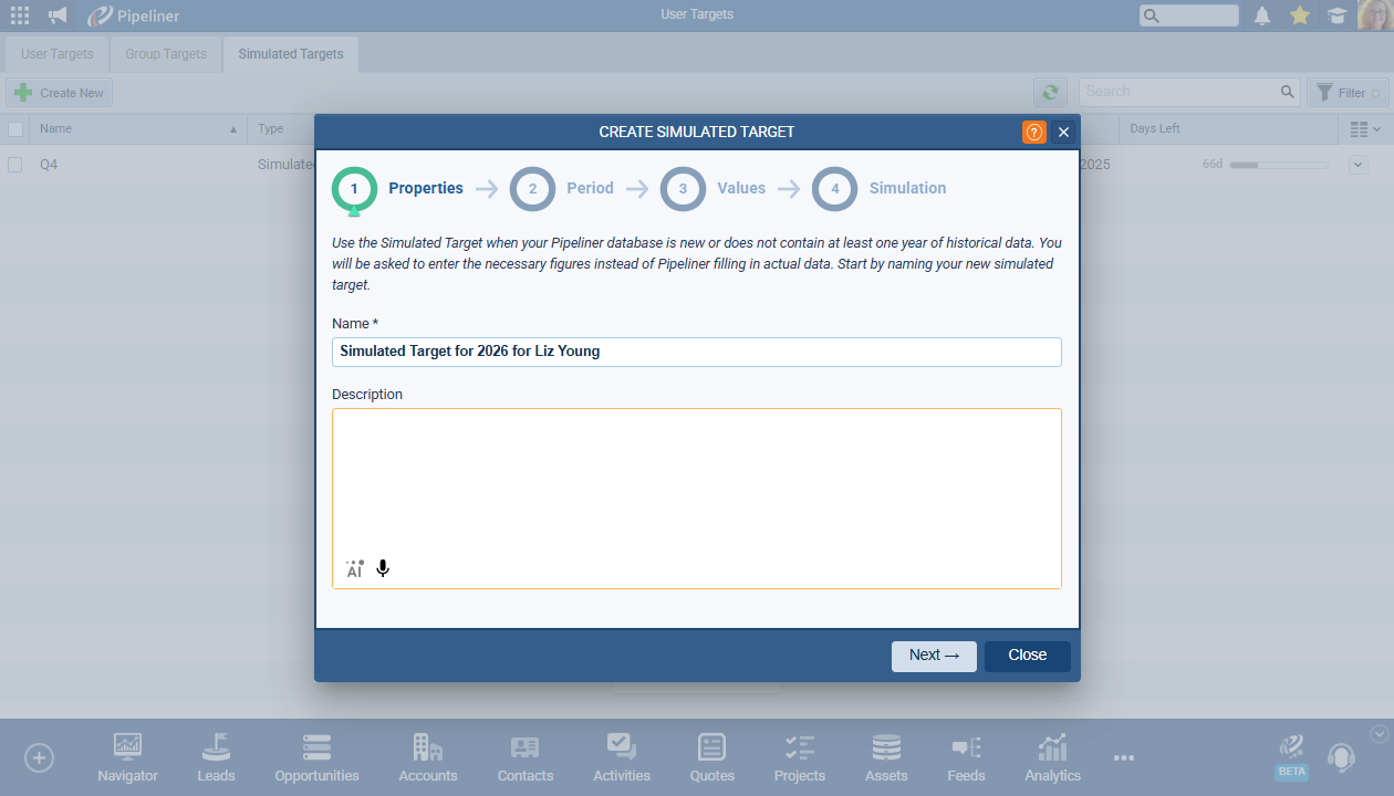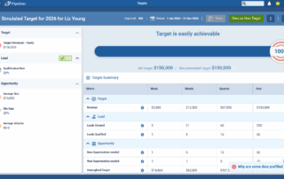 Creating a Simulated Target allows users to fill in input fields for LeadLead Lead refers to a prospect or potential customer (who can be an individual or organization) that exhibits interest in your service or product; or any additional information about such entity. Indicators and/or Opportunity Indicators that simulate historical data to calculate target metricsMetrics Metrics are quantities that are measured and used to:. This is particularly useful when your organisation is new to using Pipeliner or you are setting up a Target for a new user and do not have sufficient historical data on Leads and Opportunities to populate the recommended Target values.