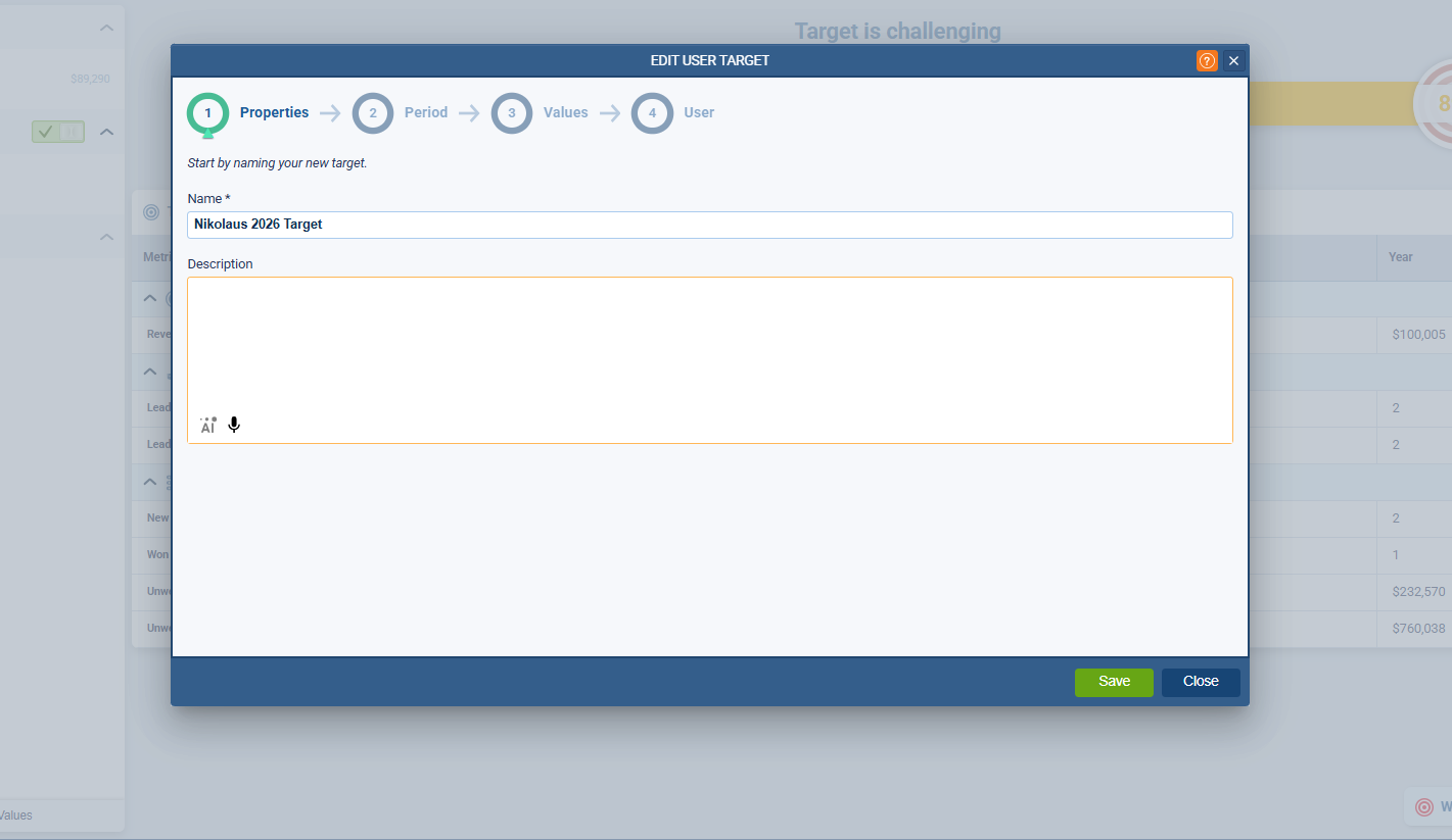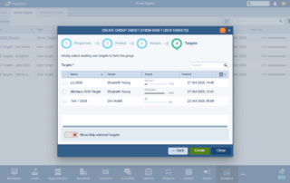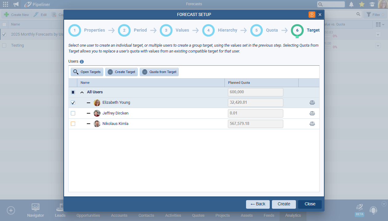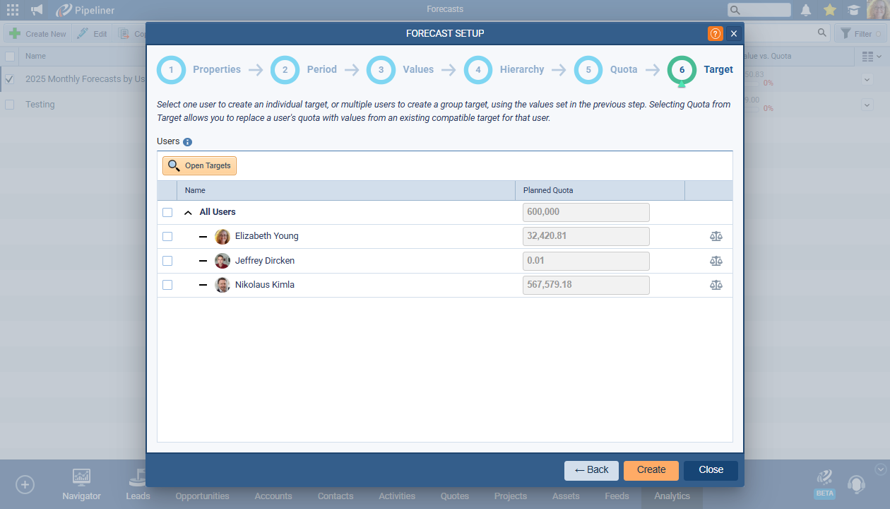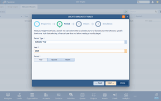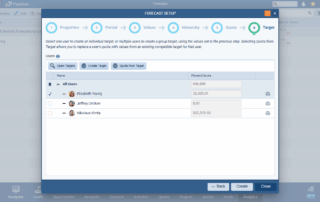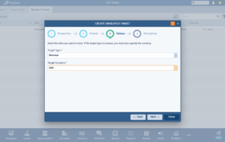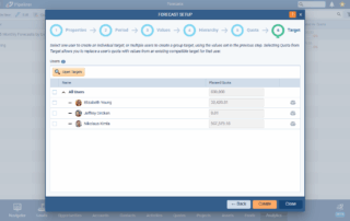 In addition to an improved wizard-driven creation process for User and Group Targets, in this release we have added a new Target type, Simulated Targets, which allow sales managers to model and estimate target performance without being tied to a user’s historical dataData Data is a set of quantitative and qualitative facts that can be used as reference or inputs for computations, analyses, descriptions, predictions, reasoning and planning.. We’ve also added the ability to create targets directly from the Forecast Setup wizard.
