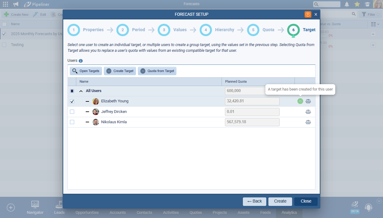 The Target step during the creation of a forecast is only enabled if users are included in the forecast hierarchy and Forecast Period settings are compatible with Target Period settings. Targets created from forecasts will always have Period Type set to ‘Calendar Year‘. If compatibility checks fail, the Target step will display a placeholder instead of the user list. The user can still skip the step and create the forecast.