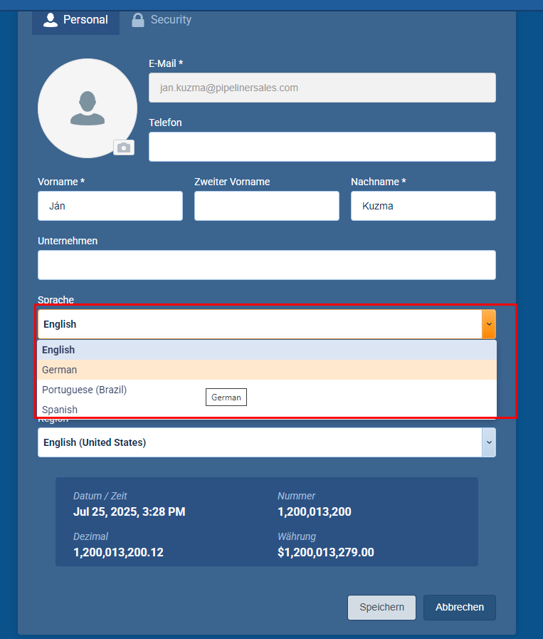 The system will read the selected language setting from the user’s “Personal” settings page and apply the chosen language as the default pre-selected language in the language dropdowns of all specified AI features.