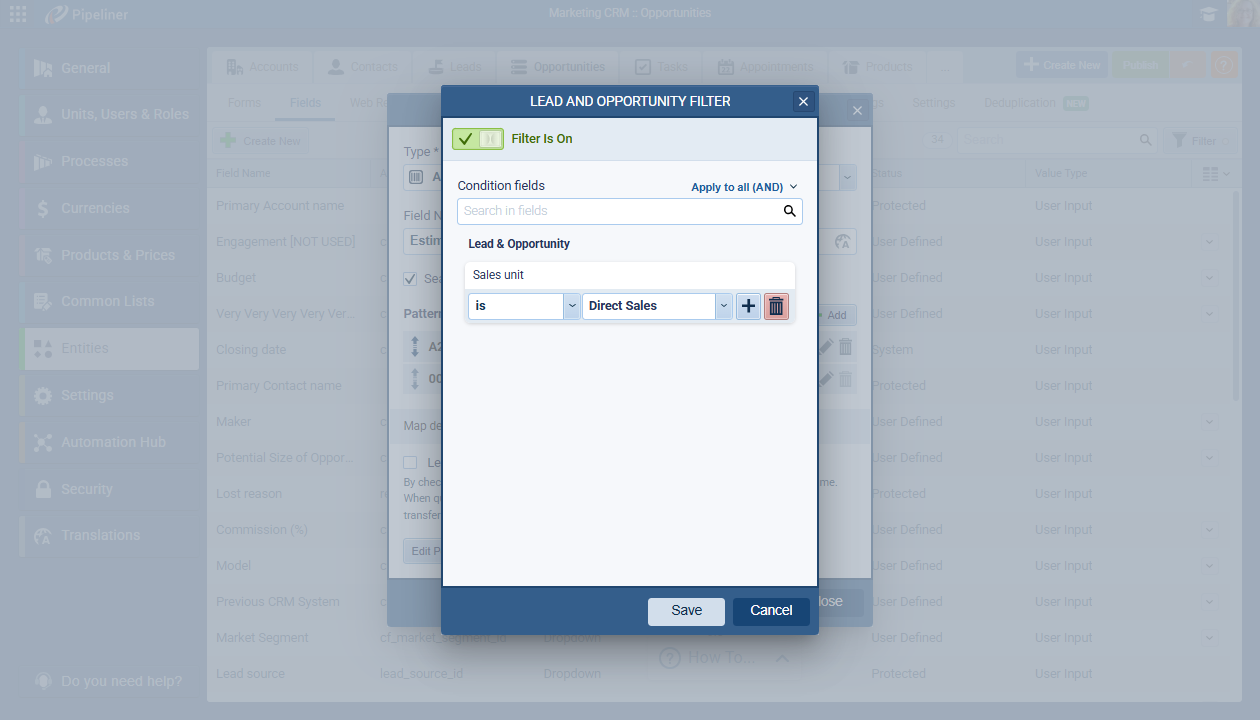 - For the “Lead” and “Task” entities, the dropdown list of users include an empty value to represent “Unassigned“.