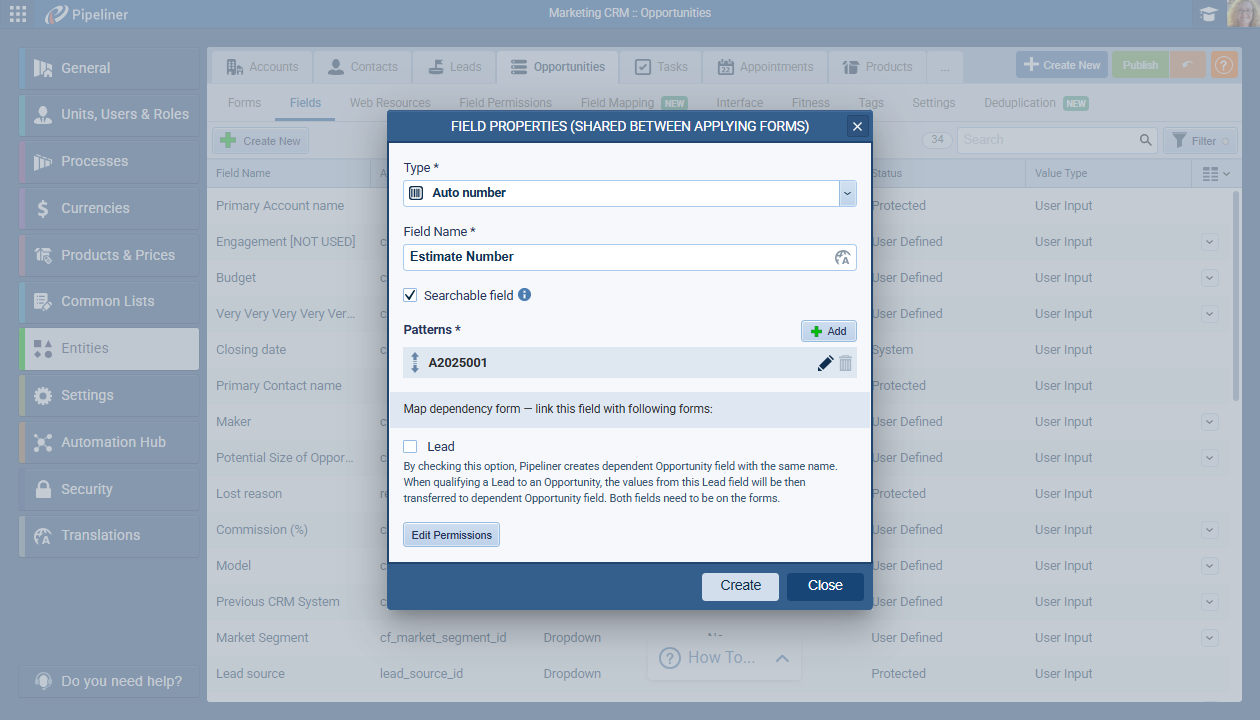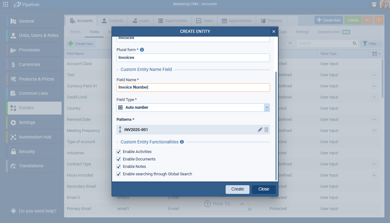 When creating a new Custom Entity and selecting “Auto number” as the name field type, the same “Patterns” configuration options as a standard Auto number field will be displayed and the same warning dialog will be shown on creation if multiple patterns are defined.