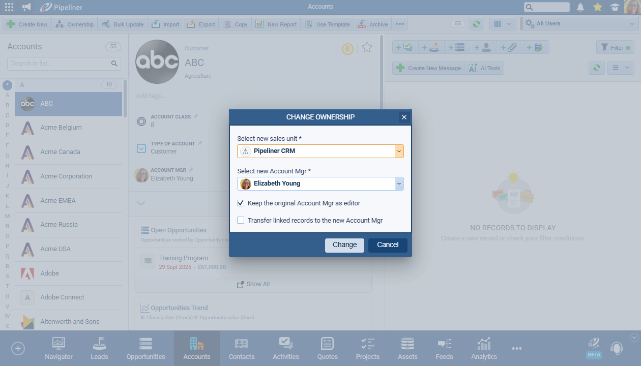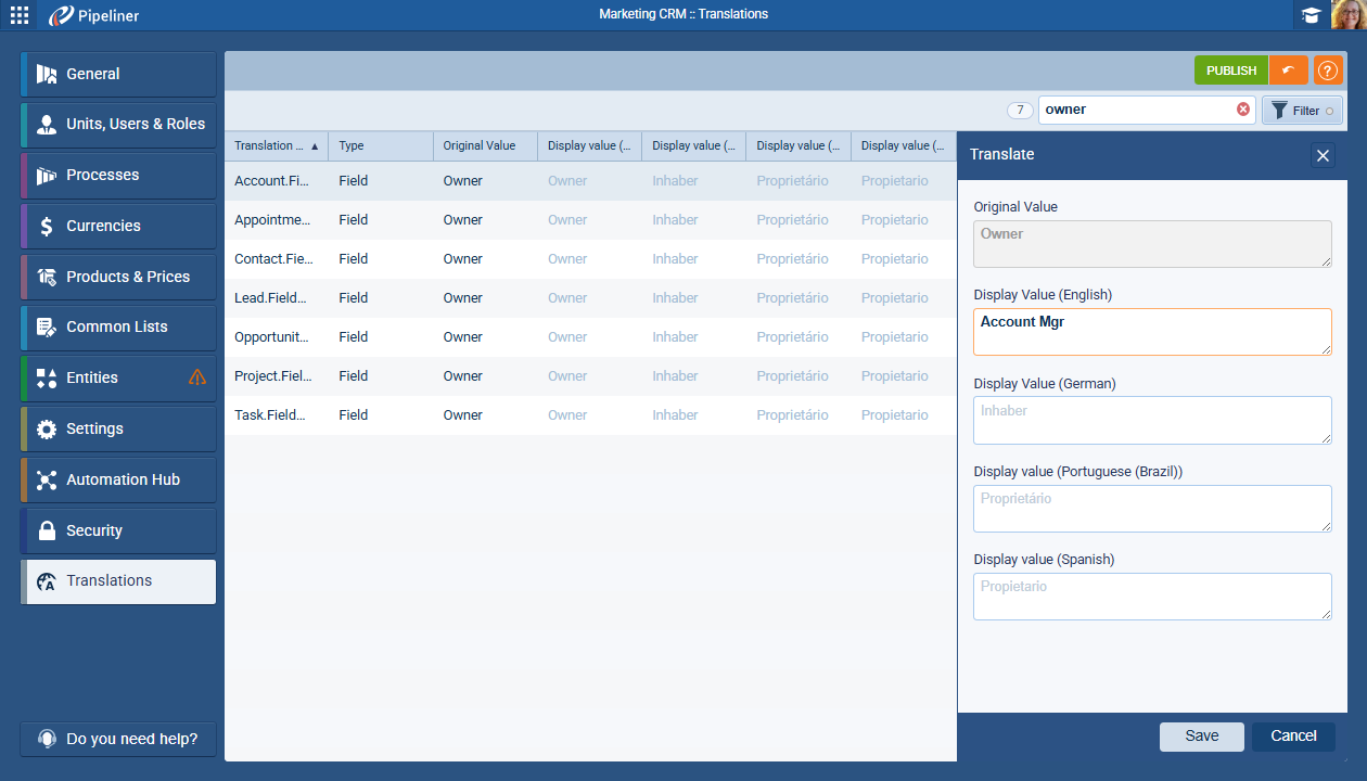 This feature extends the translation capabilities of the application to the “Owner” label. When an administrator renames the “Owner” field for a specific entity in Admin Translations, the new term will be reflected consistently across various UI components, including record detail views and the “Change Ownership” dialog. If no custom translation is set for an entity, the default label “Owner” should be used.