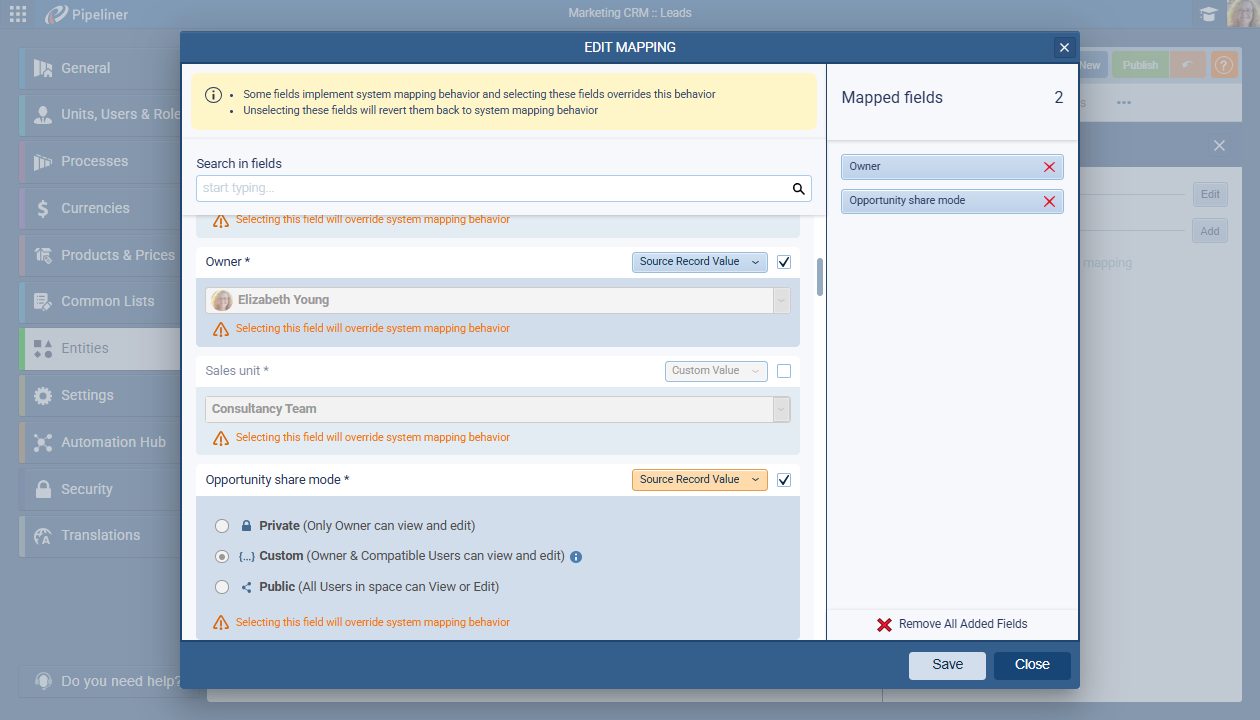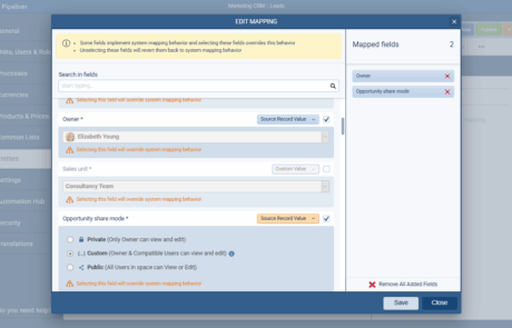 This feature enhances the Field Mapping and ConversionConversion Conversion is the process of turning a target consumer into a paying customer; or more generally, the point at which a user performs a specific action favorable to a marketer or a seller. forms by adding support for several key system fields: Owner, Share mode, Editors, and Watchers. This allows for more comprehensive record creation and conversion workflows. Additionally, the UI for these fields on detail forms will be updated for better visual indication.