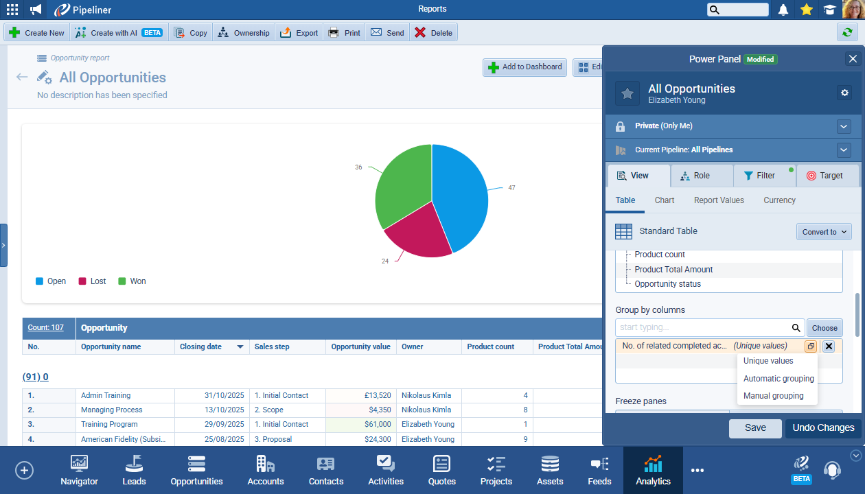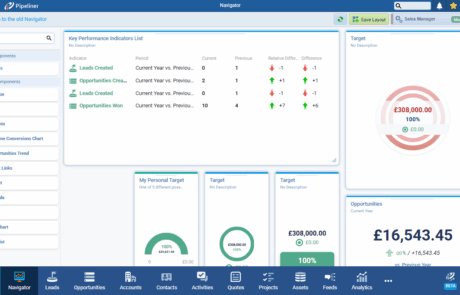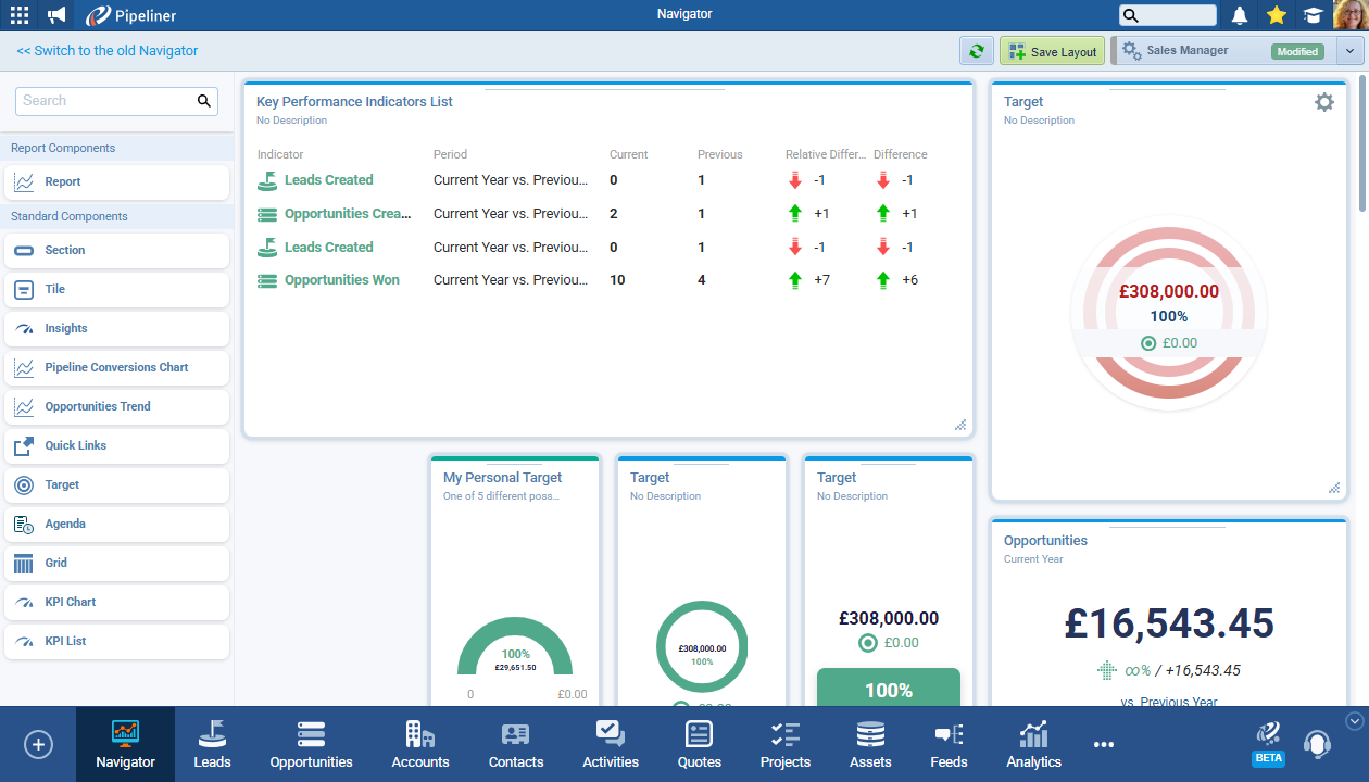 - The current Target chart component has been replaced with the new “Pipeline Target” visual style which displays the achieved value prominently in the center, with the target value shown below it.