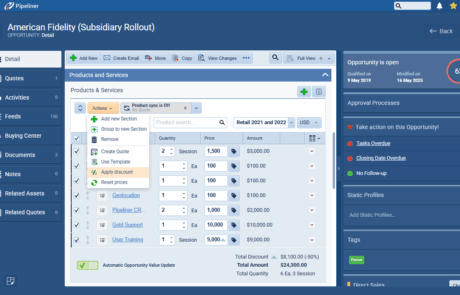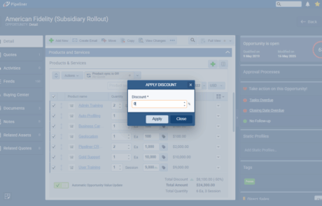 When Products have been added to an Opportunity using a Price List, users can select one or more product rows and then select the option “Apply Discount”.