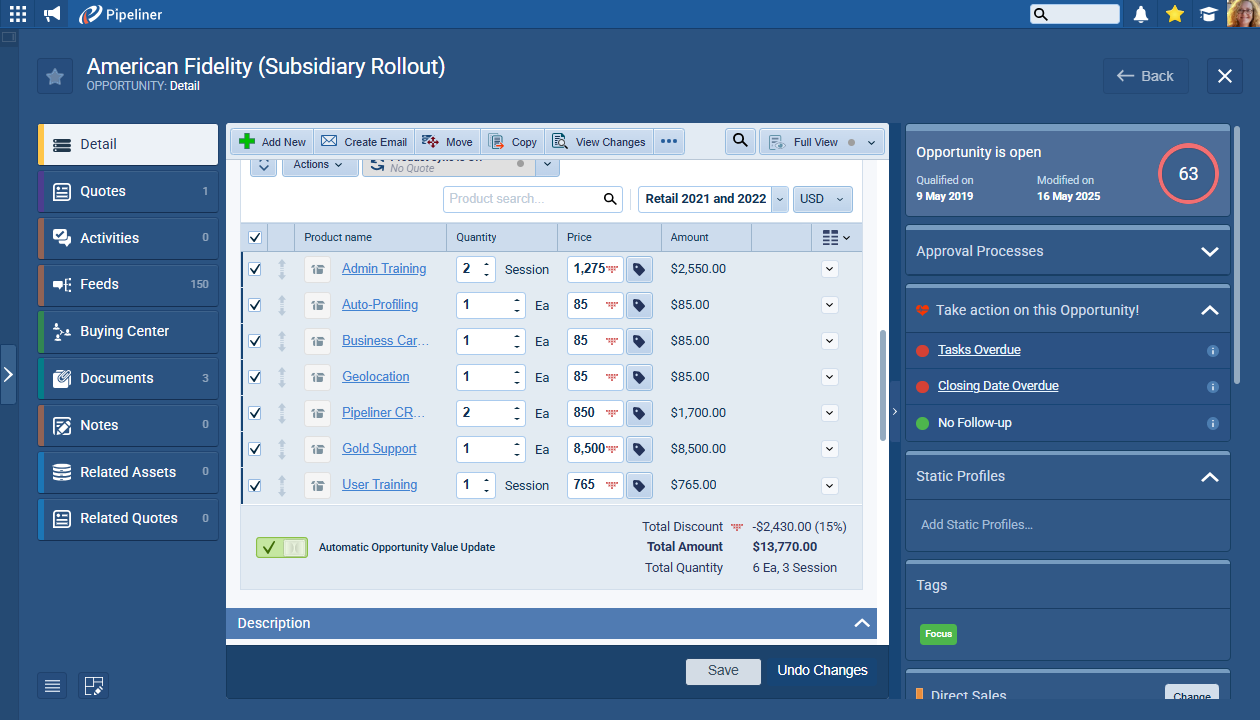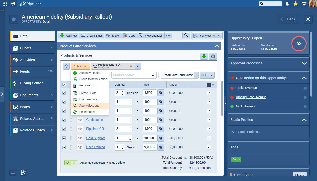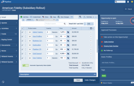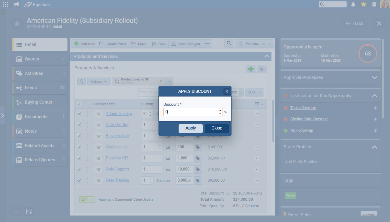 This feature introduces a bulk action to apply a percentage-based discount to multiple selected products within an Opportunity’s product list. This streamlines the process of discounting, as users no longer need to apply discounts to each product individually.