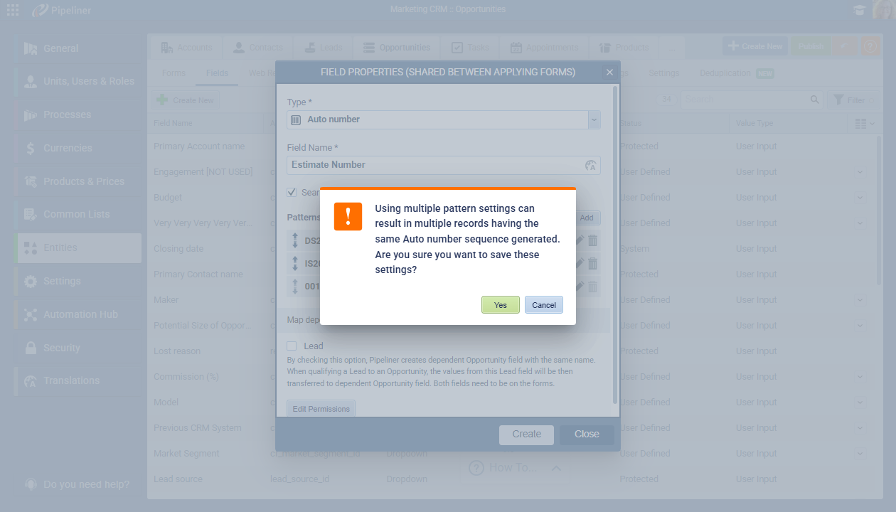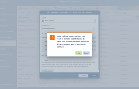 When creating an Auto number field with more than one pattern, a warning dialog will be displayed.