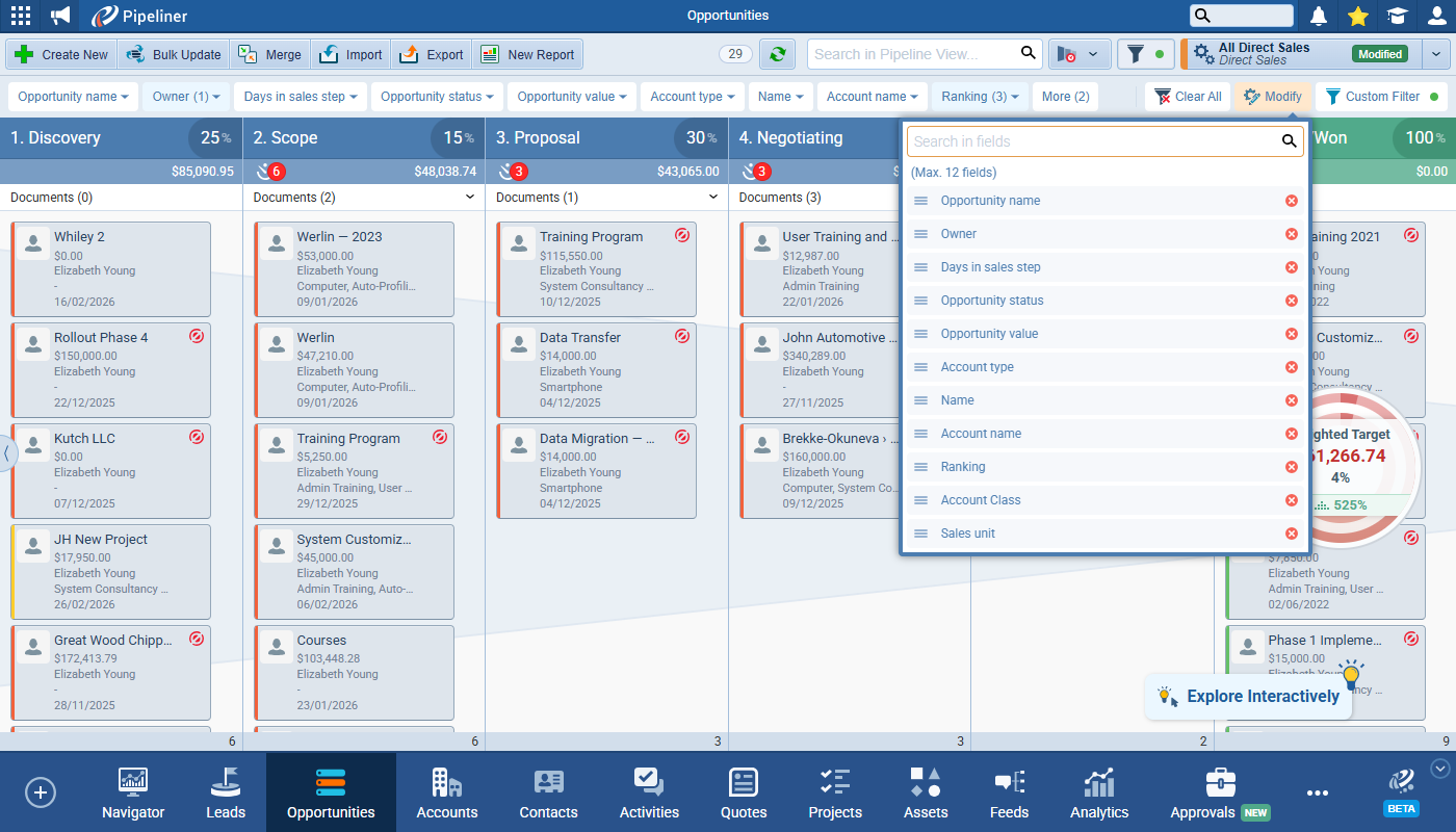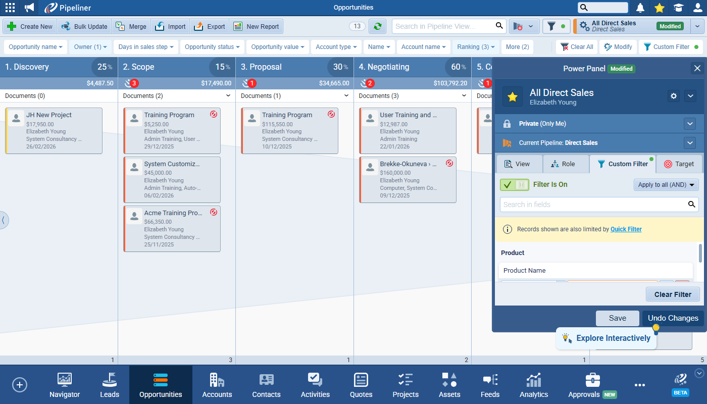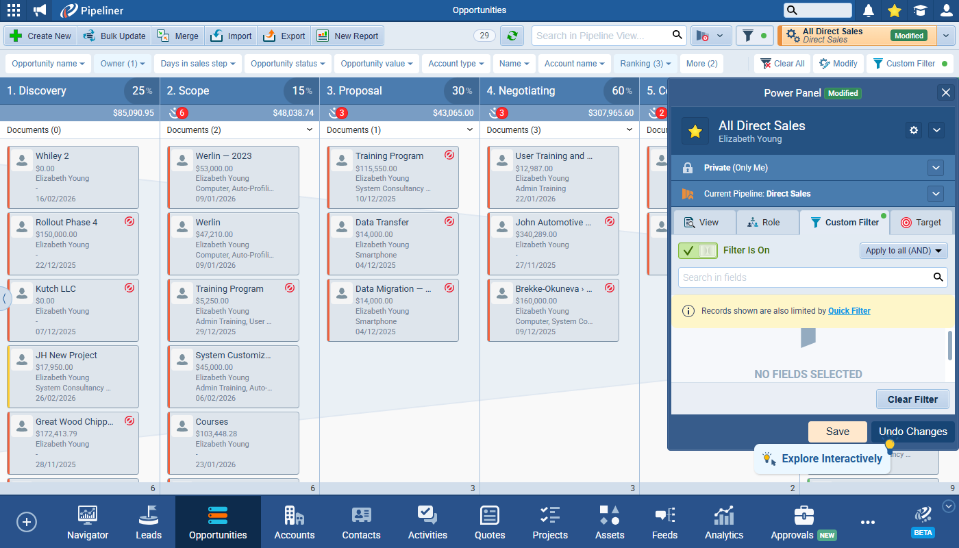 This release introduces the new Quick Filter feature. This makes filtering and segmenting your Pipeliner dataData Data is a set of quantitative and qualitative facts that can be used as reference or inputs for computations, analyses, descriptions, predictions, reasoning and planning. even easier by giving users a customisable toolbar allowing them to set any field for quick filtering right there on screen. The Custom Filter tab still exists in the Power Panel for complex filter criteria and Quick Filters and Custom Filters operate in conjunction with each other. ⤵