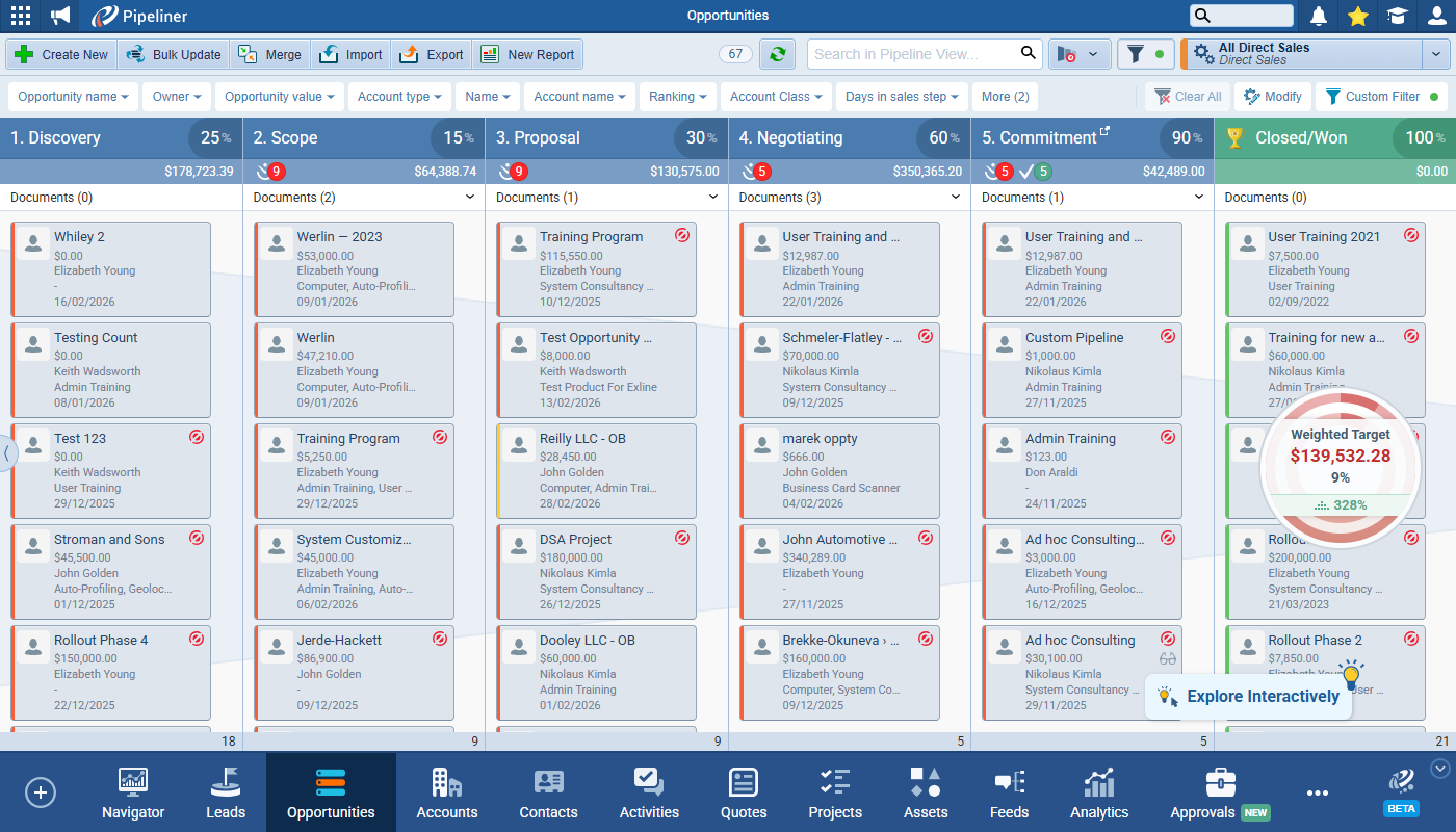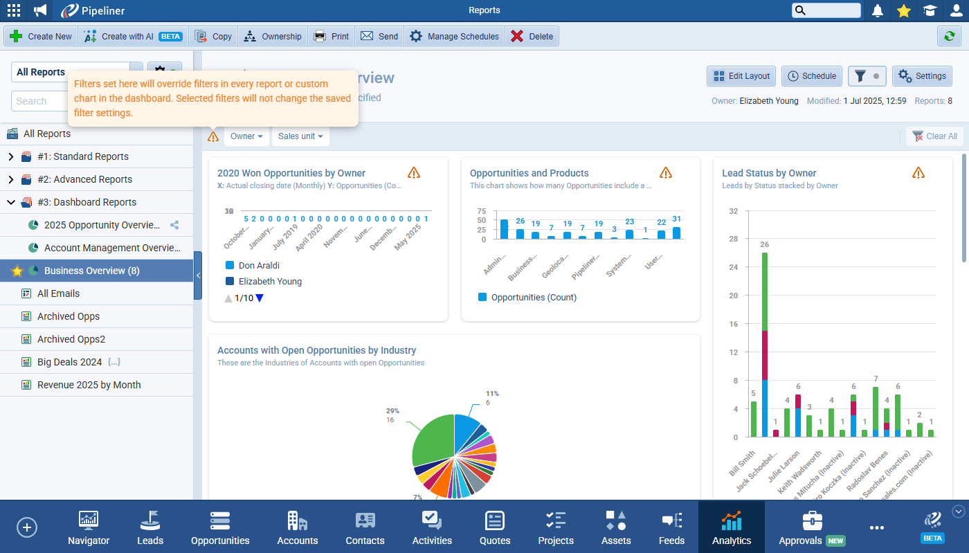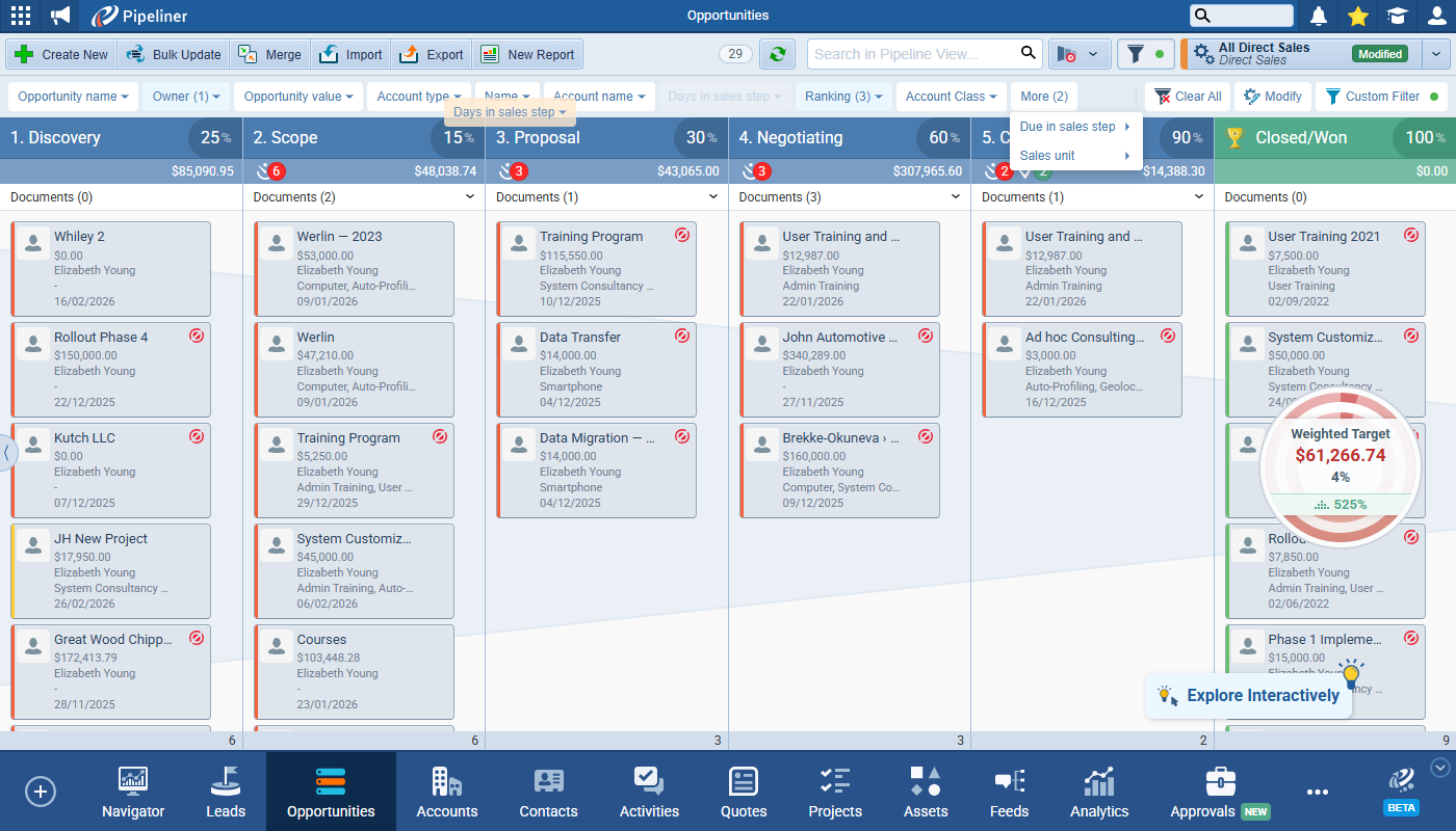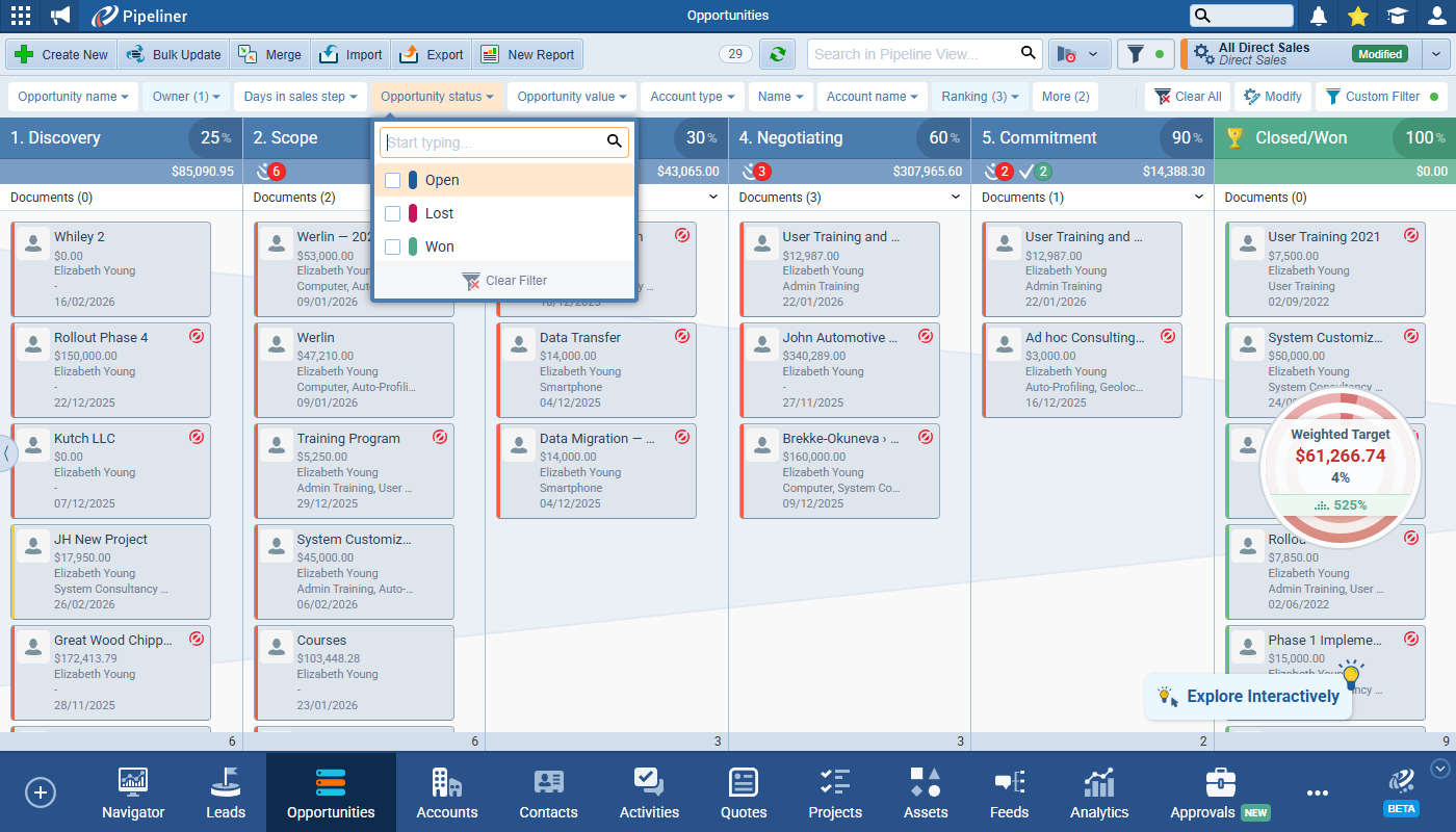 This release introduces the new Quick Filter feature. This makes filtering and segmenting your Pipeliner dataData Data is a set of quantitative and qualitative facts that can be used as reference or inputs for computations, analyses, descriptions, predictions, reasoning and planning. even easier by giving users a customisable toolbar allowing them to set any field for quick filtering right there on screen. The Custom Filter tab still exists in the Power Panel for complex filter criteria and Quick Filters and Custom Filters operate in conjunction with each other. ⤵