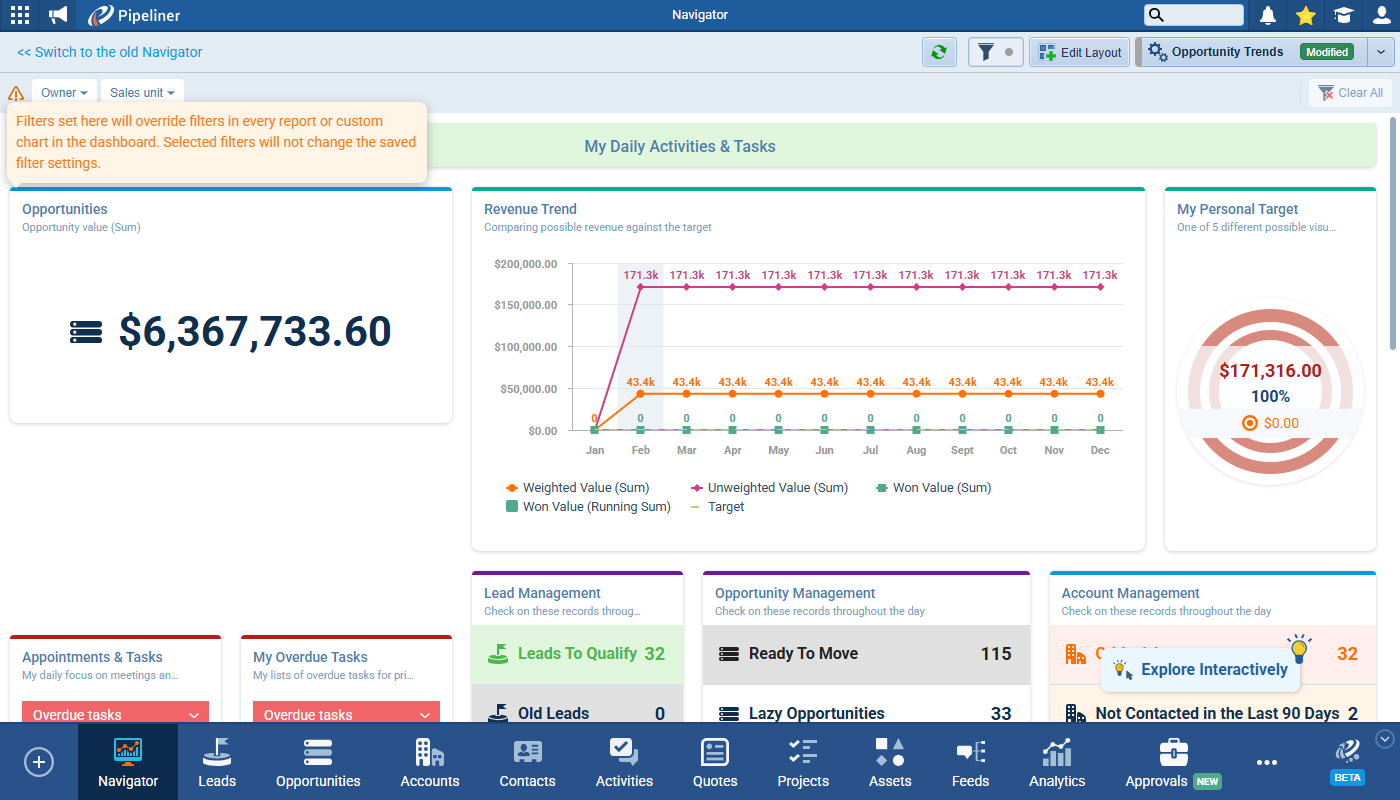 Quick Filter is supported in both the new and old navigator experiences but, in the navigator context, the default fields are limited (for example Owner and Sales Unit), and management capabilities are reduced (no Modify, no Custom Filter). Only Clear All is available when any criteria is set. The previous Filter tab has been removed as options are moved over to the new Quick Filter toolbar. ⤵