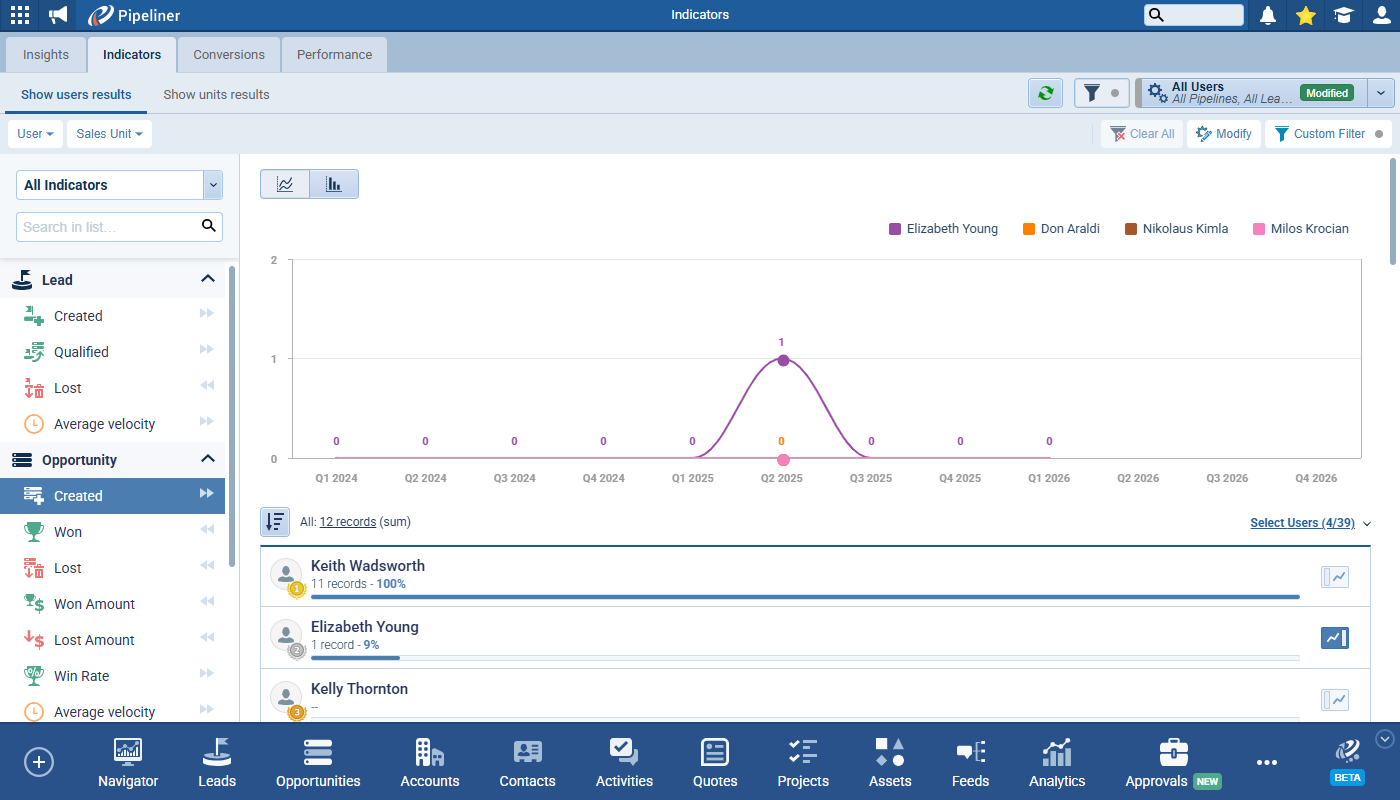 Each tab has its own default fields (for example, Insights/Indicators default to User + Sales Unit; Conversions/Performance default to Owner + Sales Unit). The previous Filter tab has been renamed to Custom Filter. ⤵