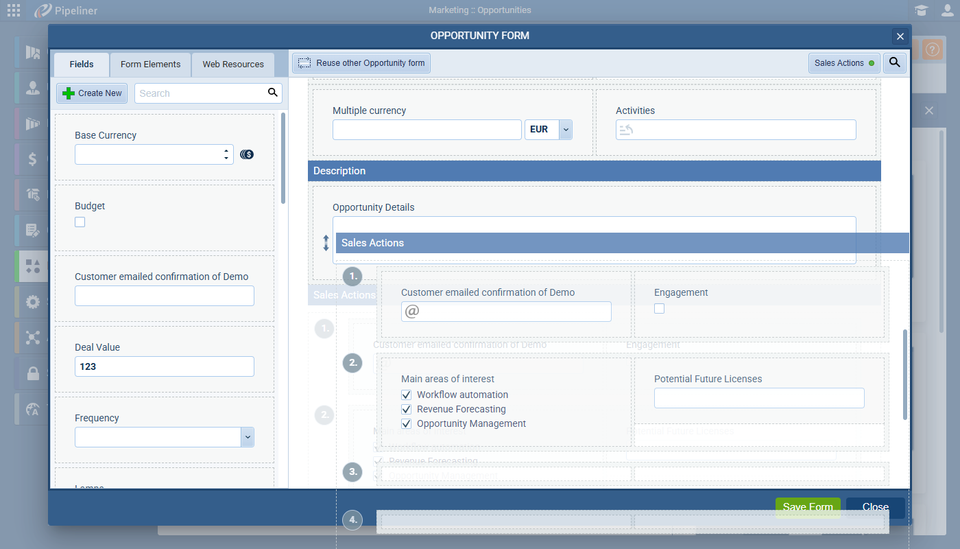 The Sales Action section within an Opportunity Form can now be moved and placed anywhere within the Form Layout. ⤵